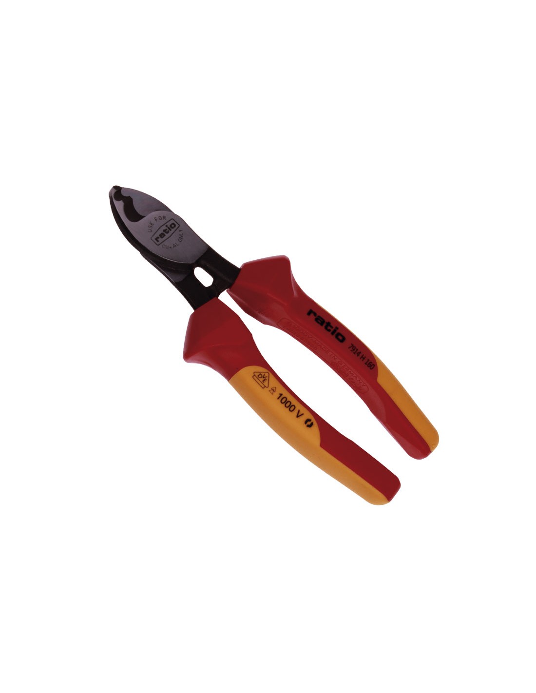 Alicates seguridad RATIO ProSeries VDE Acero aleado especial con acabado pulido y negro atramentado. Mangos aislados 1.000 V. Tratamiento inducción en zonas de corte. Mango ergonómioco antideslizante bimaterial. Homologación VDE-GS. Cortacables. 160 mm.