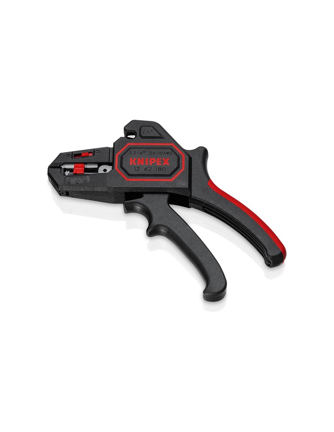 Alicate pelacables autoajustable KNIPEX 12 62 180 Trabajo más rápido: se ajusta automáticamente a la mayoría de tipos de cable, con un ajuste preciso para materiales especiales. Para cables con conductores finos, unitarios y múltiples de 0,2 a 6 mm2 con aislamiento estándar. 180 mm. Cables 0,02-6,0 mm2.