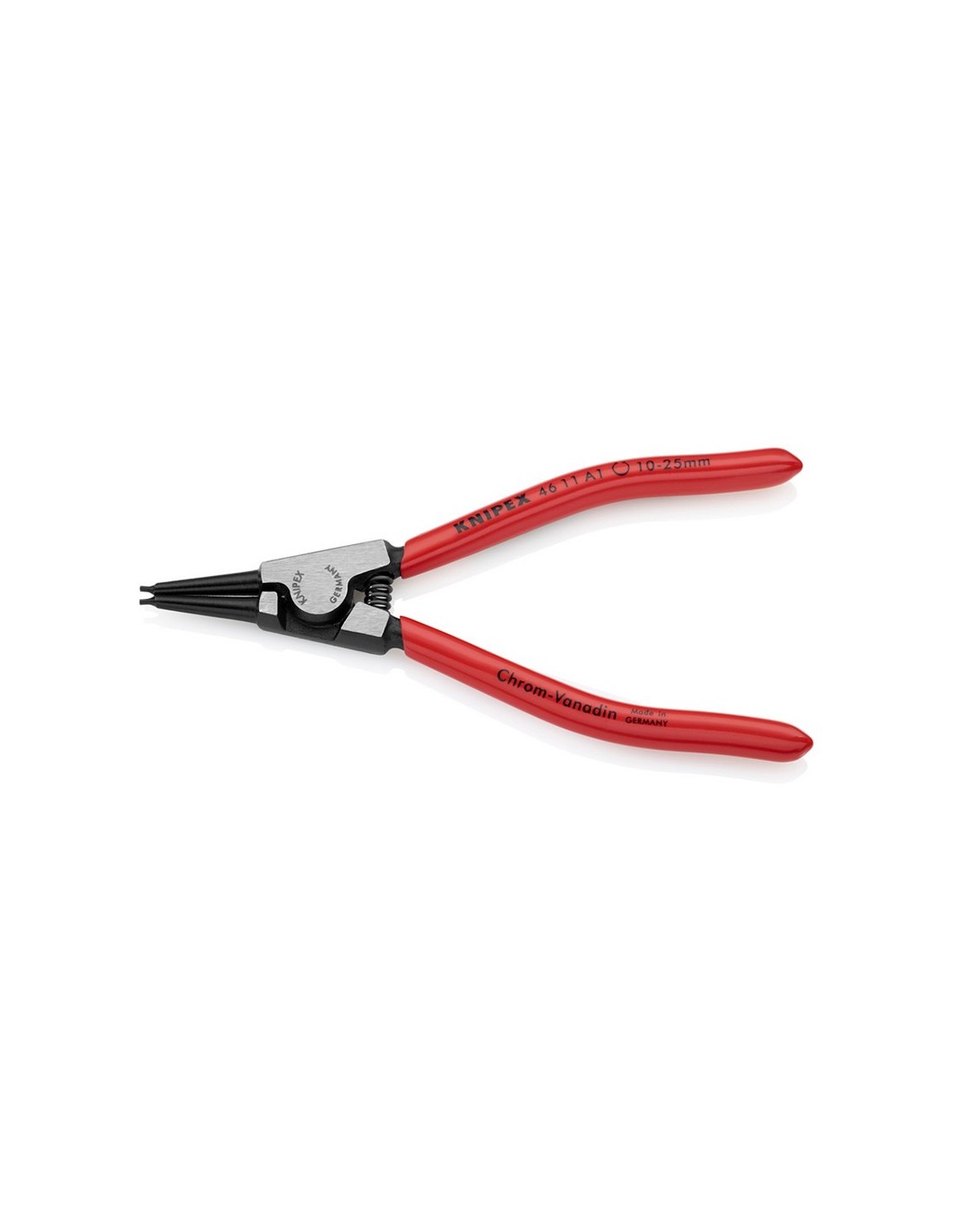 Alicate arandelas exteriores puntas rectas KNIPEX 46 11 A Acero cromo-vanadio forjado. DIN 5254A puntas rectas. Puntas antideslizantes de gran estabilidad. Mangos recubiertos plástico. ø 10 - 25 mm. 140 mm.