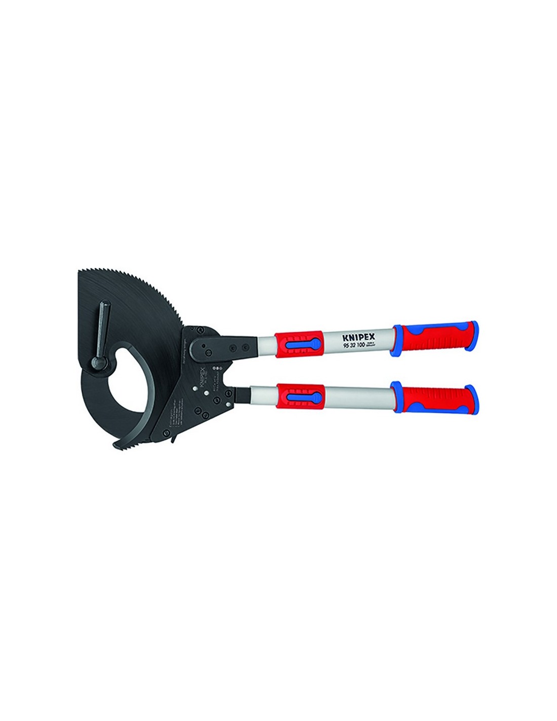 Cortacables tipo carraca KNIPEX 95 32 100 Mangos telescópicos 650 - 860 mm. Para cables de cobre y aluminio, de un hilo o múltiples hilos, también con recubrimientos de goma o plástico duros. Empuñaduras bimaterial antideslizante. 680 mm. Corte máx. ø 100 mm.