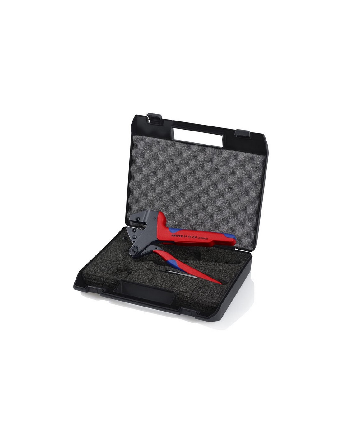 Estuche alicate crimpado terminales KNIPEX 97 43 200 Solo una herramienta para casi 1.000 aplicaciones de crimpado. Crimpadora de sistema de mordaza intercambiables. Mangos bimaterial antideslizante. Alicate 200 mm.