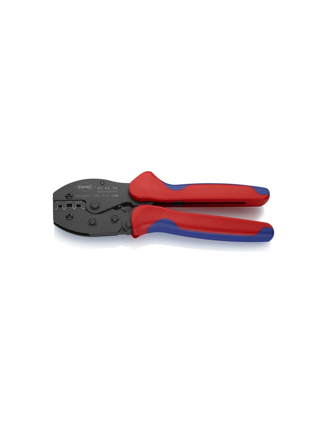Alicate crimpado terminales KNIPEX PreciForce Alicate para crimpar terminales. Conectores faston no aislados (anchura del conector 2,8 + 4,8 mm) 0,1 - 2,5 mm². Mangos bimaterial antideslizante. 220 mm. 4 posiciones crimpaje.