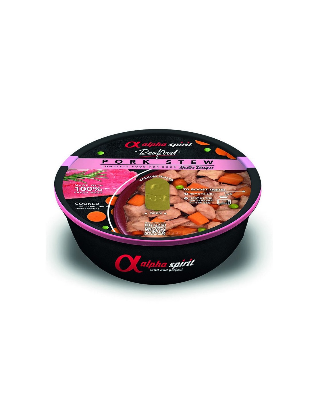 ALPHAReal Food ALPHA SPIRIT Elaborado 100 % con carne fresca. Cocinado a baja temperatura. Envase Openvac, permite cocinas a baja tempertura, preservando las propiedades de los alimentos. Mantiene el producto al vacio prolongando la vida útil de los alimentos. Diseñado con una alación de grado humano apata para calentar en microondas. Utilizable como comedero y respetuoso con el medido ambiente. 100 % reciclable. Estofado de cerdo 280 gr. 97% cerdo fresco en su salsa, guisantes, zanahoria, boniato, especias.