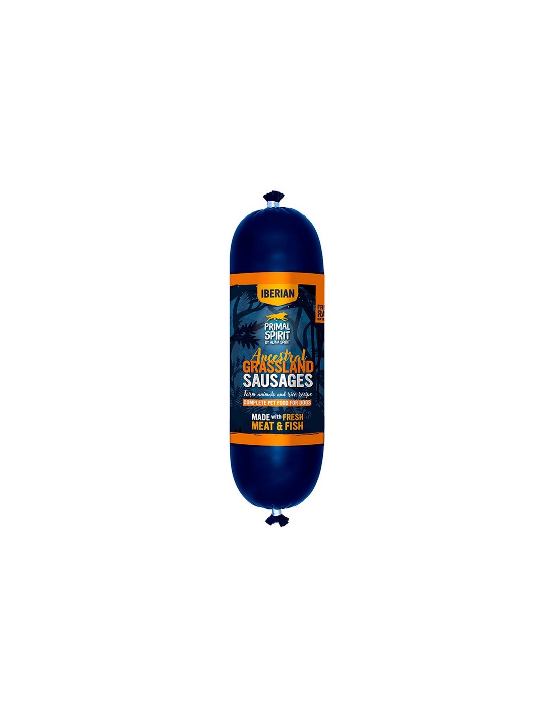 PRIMALSalchichas PRIMAL SPIRIT Alimento completo húmedo para perros adultos. Fabricación propia. Altos porcentajes de ingredientes frescos. Sin saborizantes ni colorantes artificales. No contiene fluten. Sin harinas carnicas. No extruido.Contiene vitamina E. Ancentral grassland 1 Kg. 83% cerdo fresco (riñones 5%, hígado 4%).