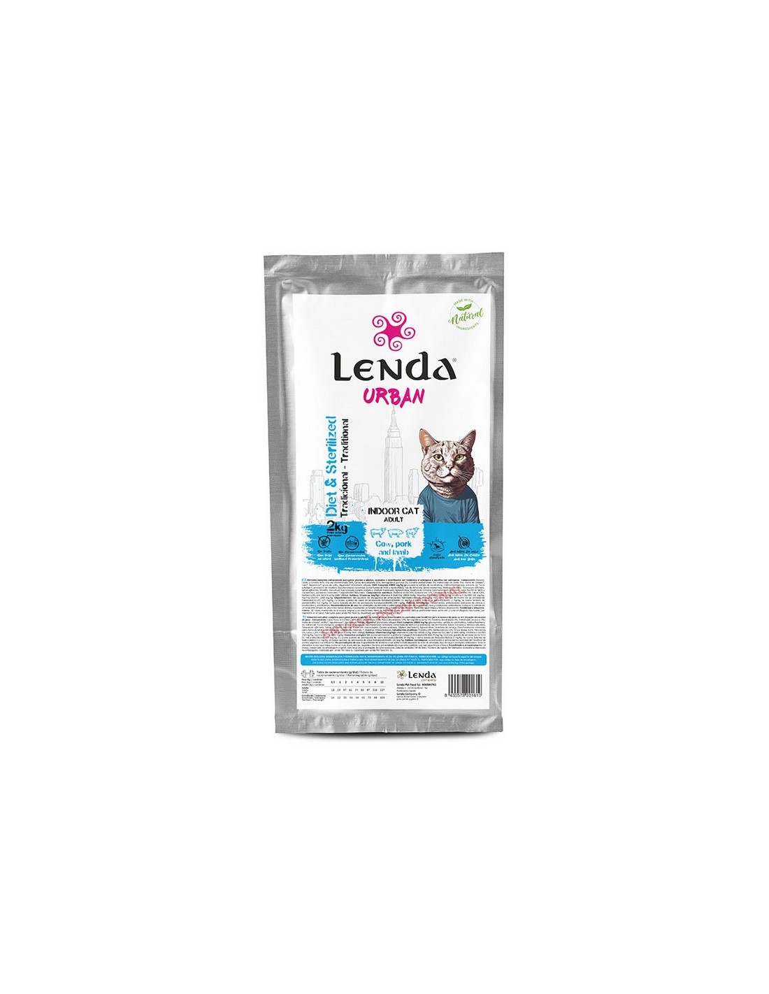 LENDAComida para gatos esterilizados LENDA Urban Libre de trigo, avena, centeno y lácteos por su impacto en intolerancias o alergias alimentarias. Productos libres de organismos genéticamente modificados (Free GMO). Sin presencia de conservantes ni colorantes de síntesis química. Para gatos adultos con tendencia al sobrepeso, castrados, esterilizados o que llevan una vida sedentaria. 2 kg.