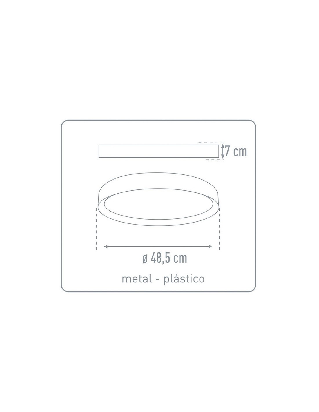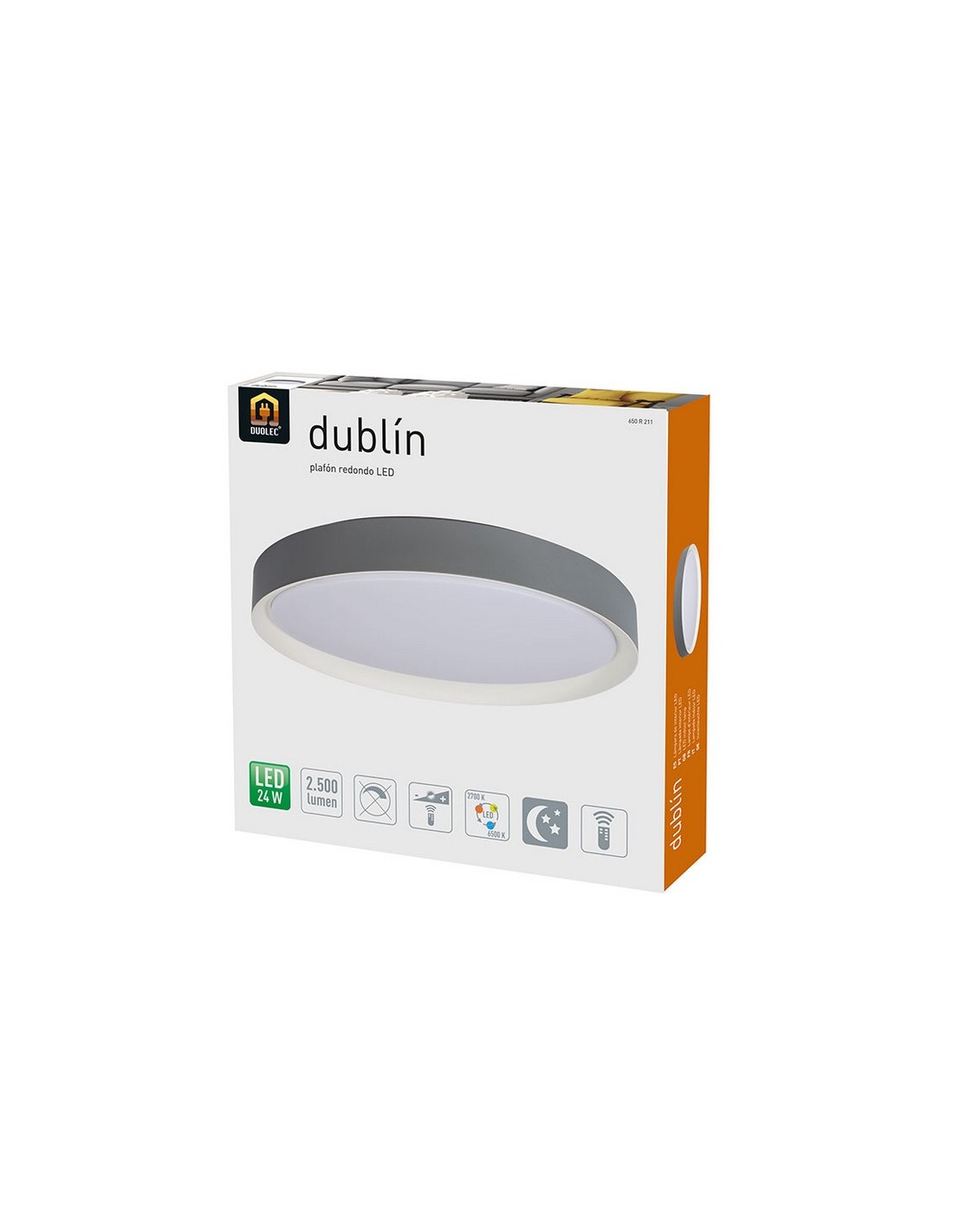Plafón LED DUOLEC Dublín Estructura acero/plástico. Mando a distancia. Función memoria. No apto para reguladores externos. Color blanco y gris. Dimensiones ø 48,5x7 cm. 24 W. 2.500 lm. 2700-6500K.