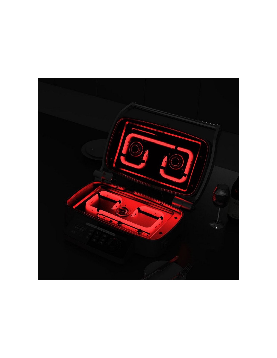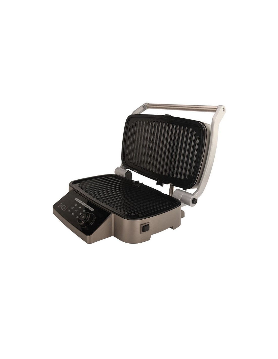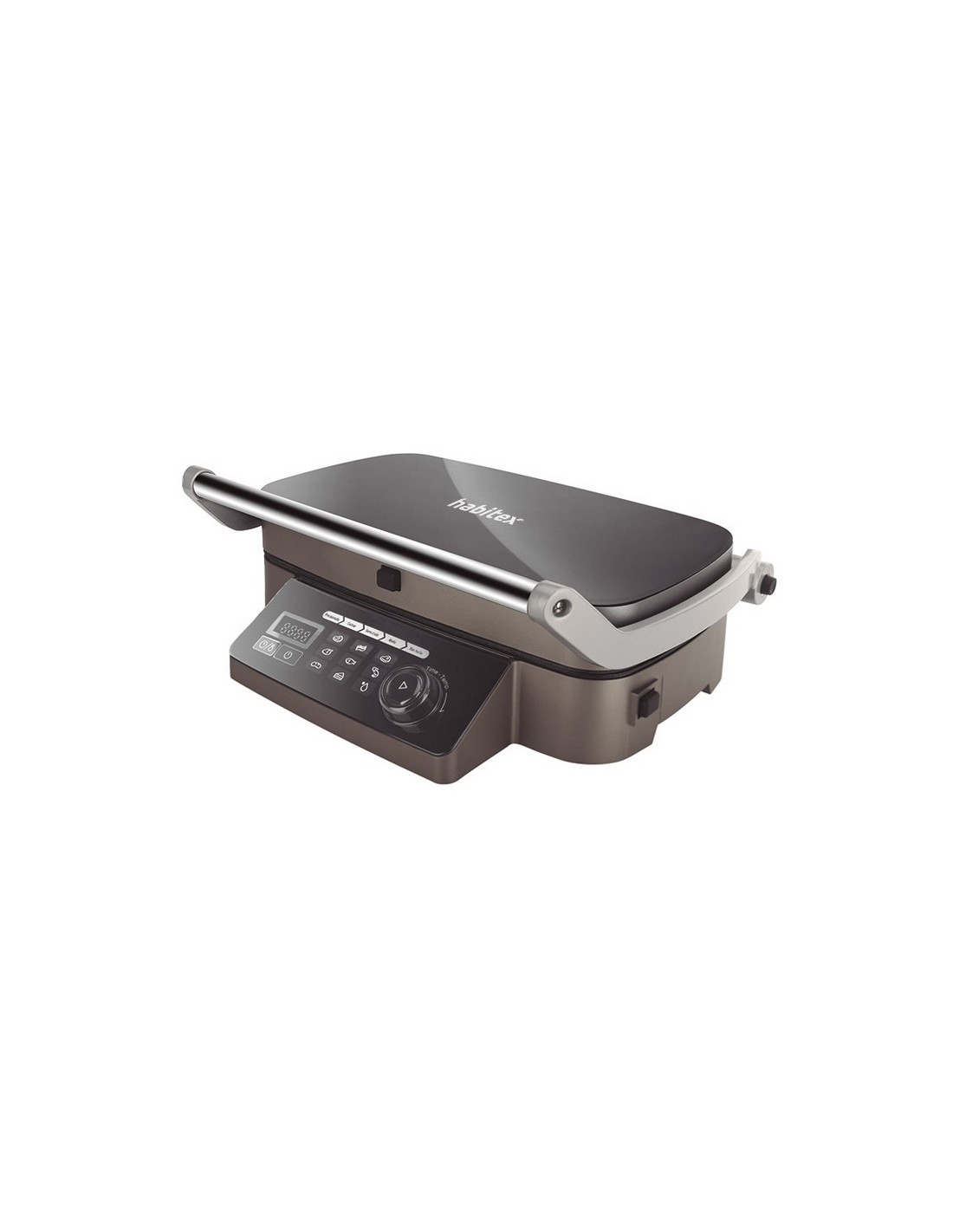 Multigrill HABITEX SC6000 Panel control digital. Precalentamiento 6 minutos. 9 programas preseleccionados. Smart Cooking Program: ajusta cocción al grosor del alimento. Apertura tapa 180º. Placas cerámicas desmontables aptas lavavajillas. Bandeja recogegrasa extraíble. Empuñadura antiquemaduras. Superficie cristal. Potencia: 1.750-2.100 W.