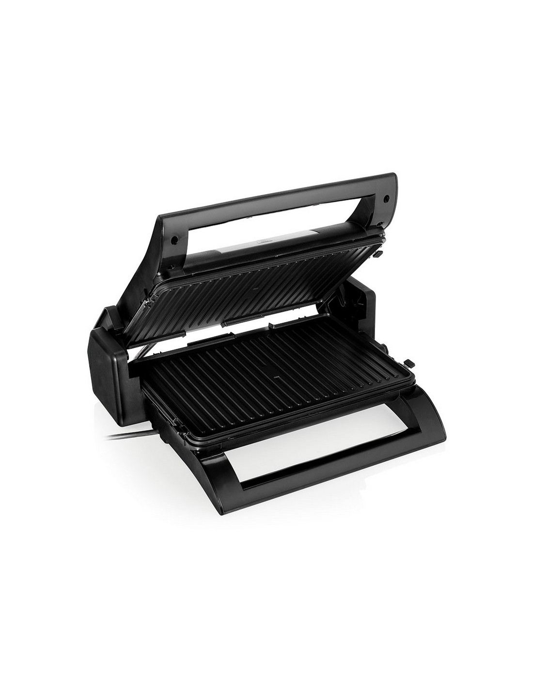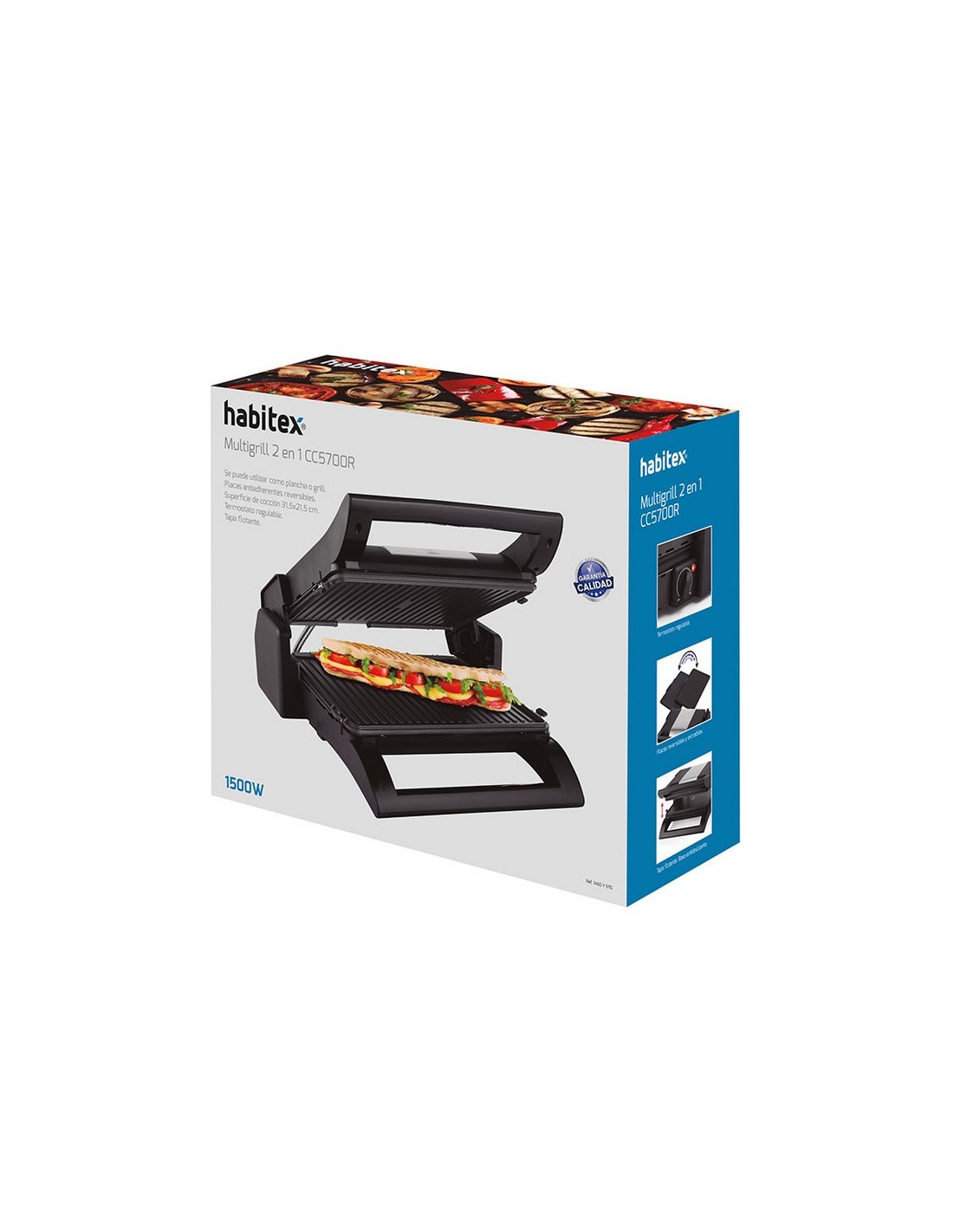 Multigrill 2en1 HABITEX CC5700R Placas antiadherentes, reversibles y extraíbles. 2 en 1: se puede utilizar como plancha o parrilla. Termostato regulable. Apertura 180º. Tapa flotante acero inox. Bandeja recoge grasa extraíble. Base antideslizante. Potencia: 1.500 W.