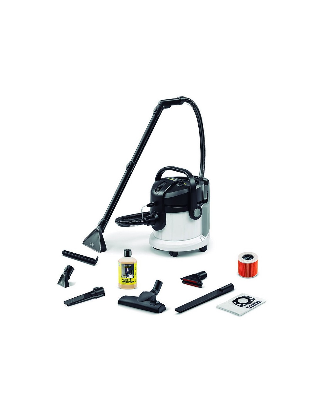 Lava aspiradora KARCHER SE-4 Plus Special Limpia las superficies textiles de forma cómoda. Ideal para familias, personas alérgicas y hogares con mascotas. Incorpora manguera de pulverización y aspiración de gran flexibilidad. Accesorios incluidos: Boquilla para ranuras, boquilla de aspiración en seco, boquilla para tapicerías, detergente, filtros de cartucho y bolsa de filtro de fieltro. 1.000 W.