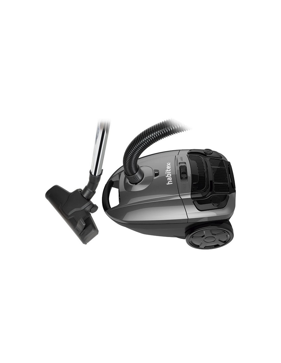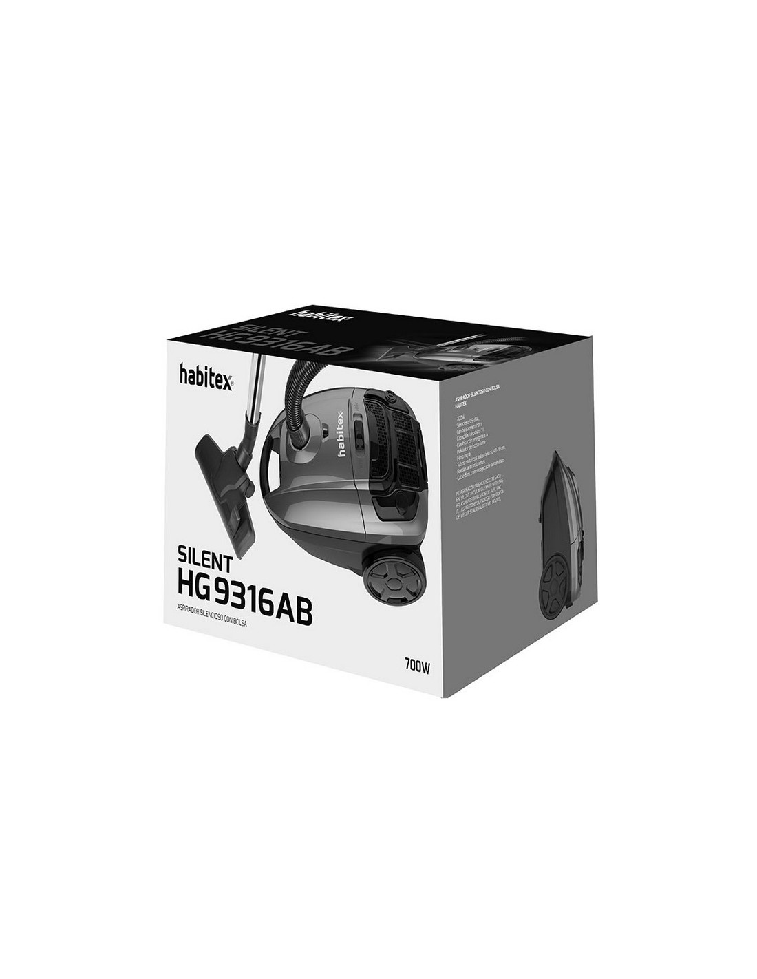 Aspirador con bolsa HABITEX Silent HG9316AB Silent Design, especialmente silencioso. Capacidad bolsa 3 litros. Regulador de potencia. Filtro HEPA. Tubos metálicos telescópicos. Almacenamiento vertical u horizontal. Ruedas antideslizantes. Asa de transporte. Cable 5 metros. Recogecables automático. 1 bolsa microfibra incluida. Indicador de bolsa llena. Clasificación energética A. Potencia: 700 W.