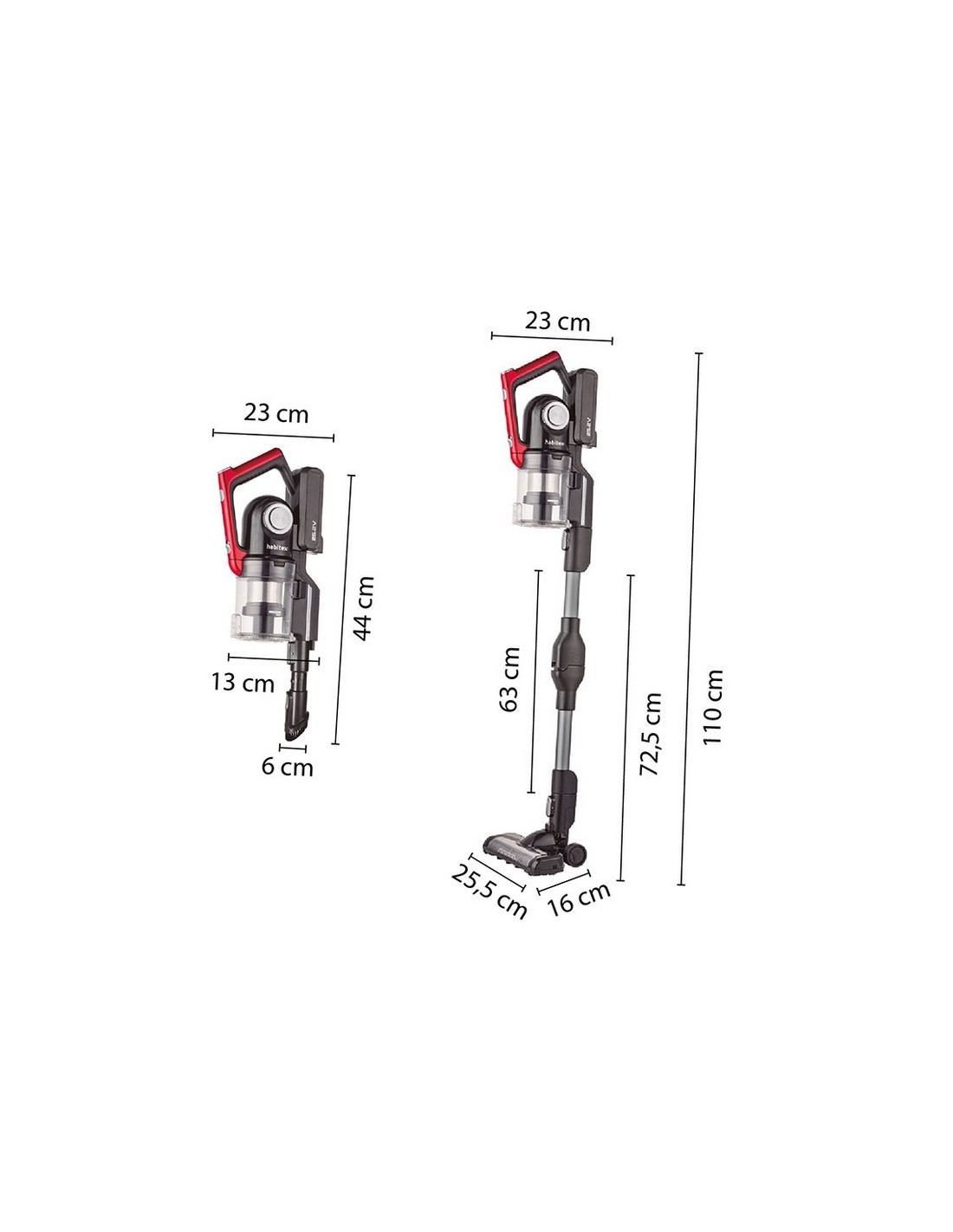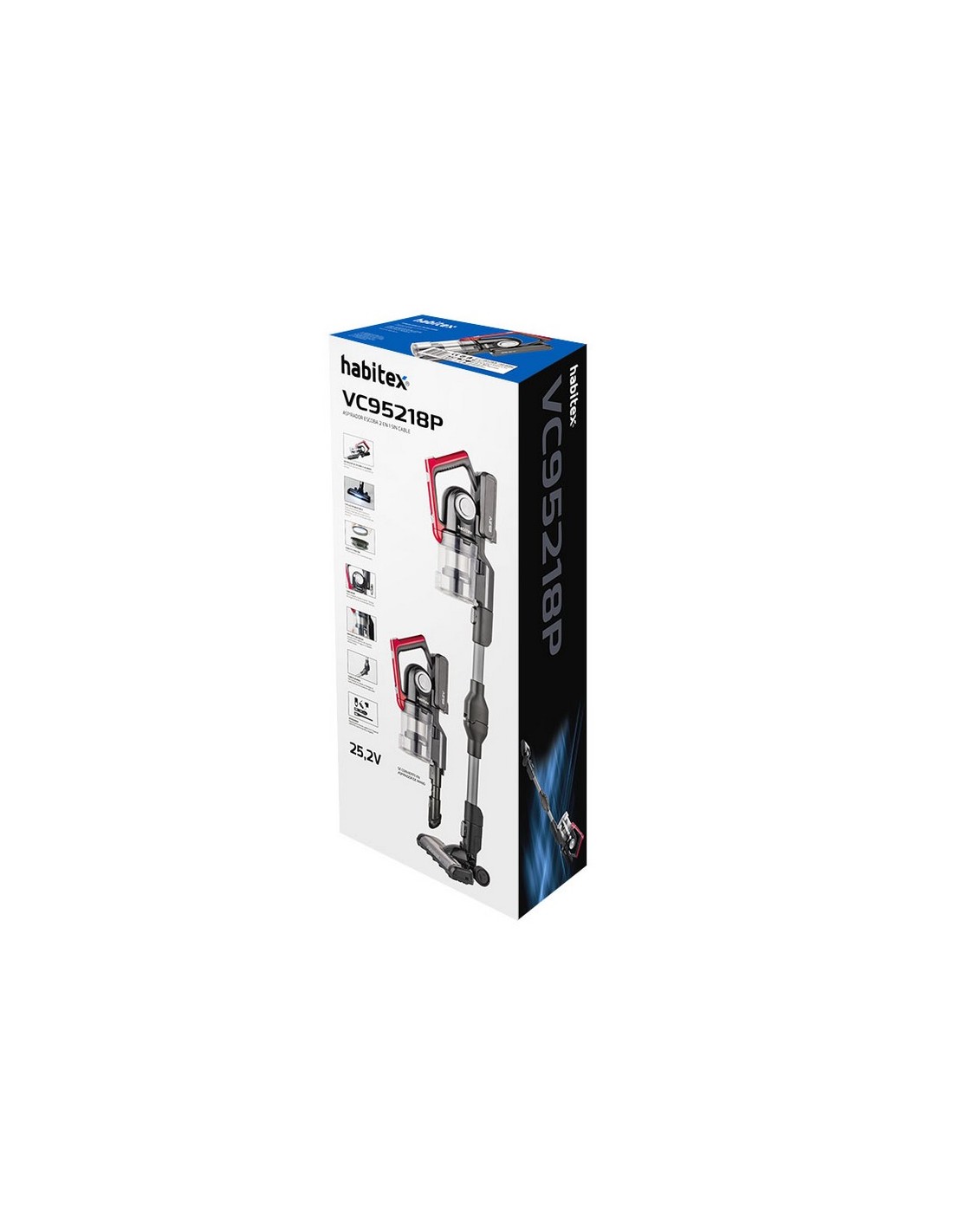 Aspirador 2 en 1 sin cable HABITEX VC95218P Motor BLDC mayor succión. Mango ergonómico. Tubo articulado. Convertible en aspirador de mano. Autonomía: velocidad máxima 8 min.; velocidad media 25 min.; velocidad ECO 55 min. Vaciado fácil. 3 velocidades: alfombras / suelos duros. Incluye boquilla para ranuras y cepillo 2 en 1 especial tapicerías. Indicador led de bateria. . Potencia: 350 W -25,2 V.