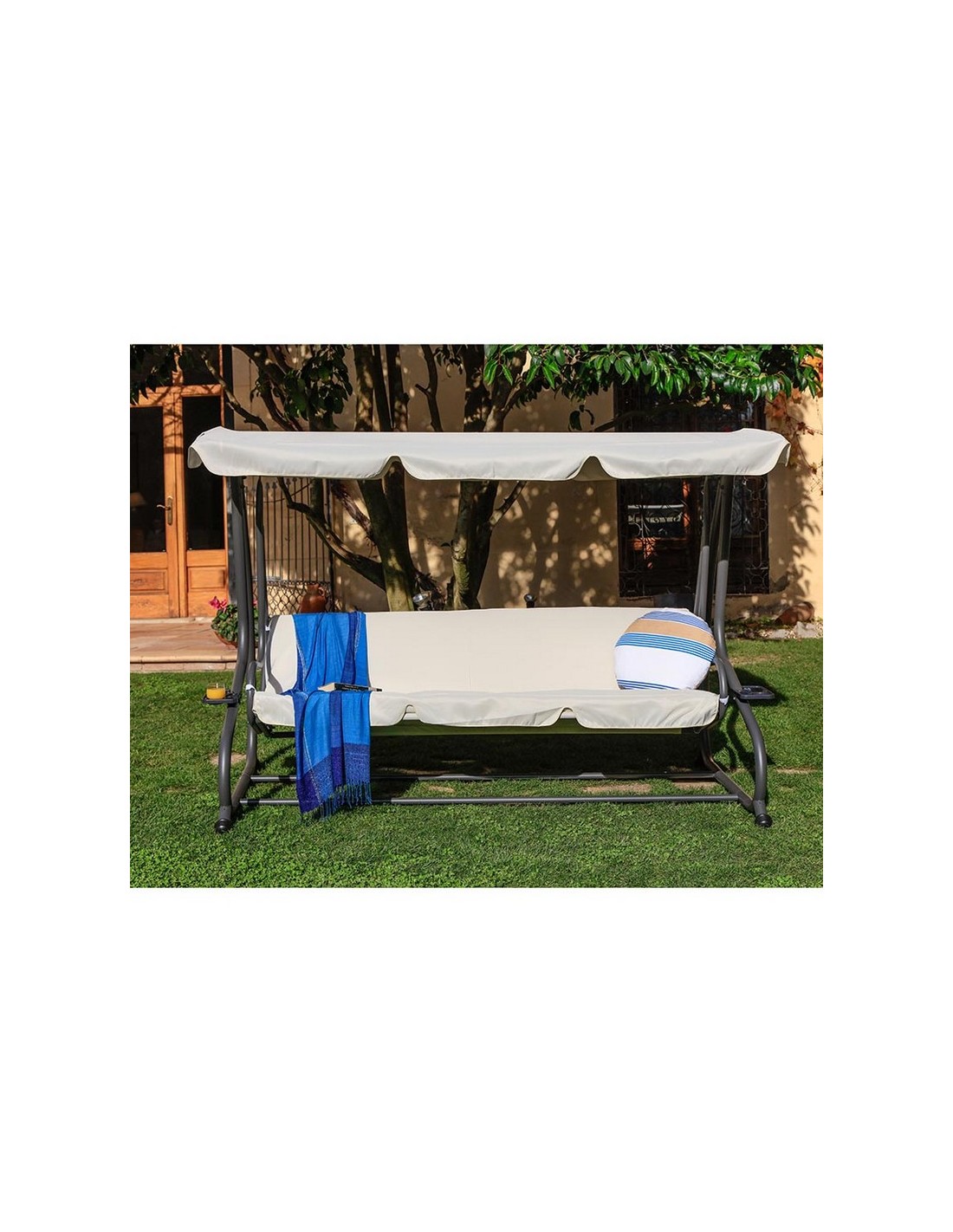 Balancín/cama 3 plazas Estructura acero gris y antracita. Toldo poliéster 180 g/m². Colchoneta en respaldo y asiento de 190x48 cm. Carga máxima 280 Kg, repartidos en 3 plazas, cada plaza 93 kg. 230x120xh.164 cm.