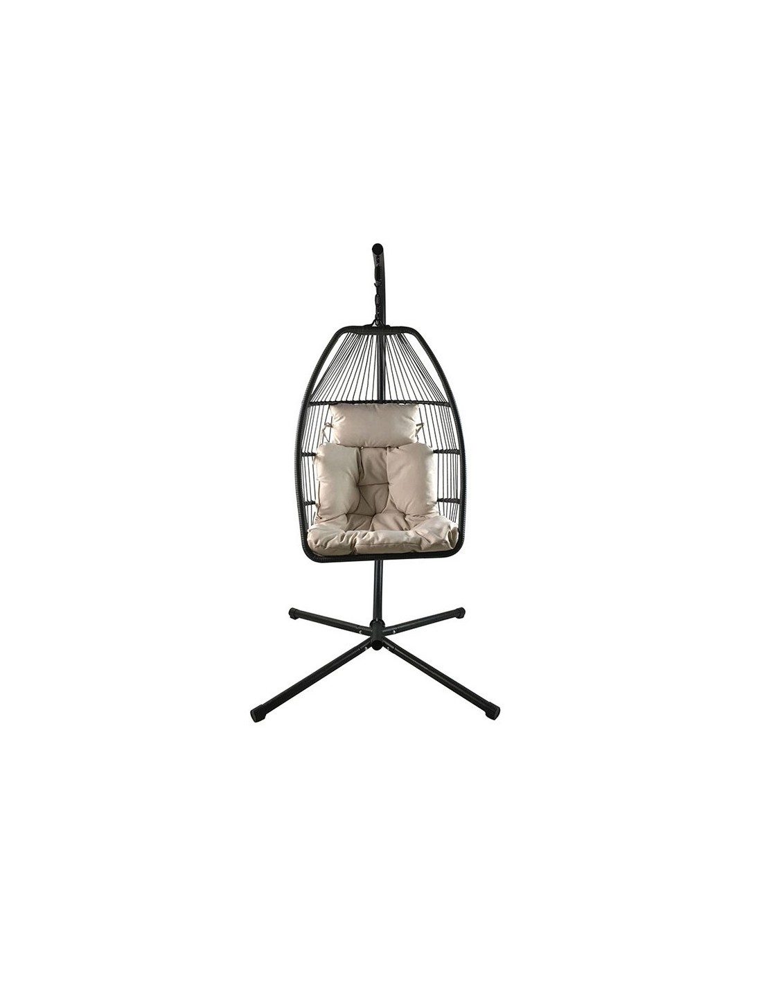 Sillón colgante plegable Balance Estructura acero recubrimiento polvo. Base y tubo acero espesor 2,5 mm.Estructura de acero del asiento: 2,0 mm espeso Poliester 5 mm y Ratán sintético 1,2 mm espesor. Cojín incluido. 104x100xh.195,5 cm.