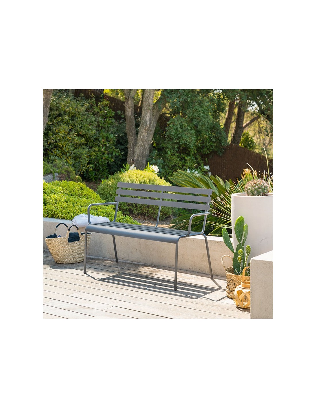 Banco reposabrazos Estructura tratada Galvanoplastia anticorrosión. Estructura tratada con epoxi antioxidante. Producto tratado contra la decoloración. Reposabrazos para un confort óptimo. Dimensiones: 114x56xh.79 cm. Grafito.