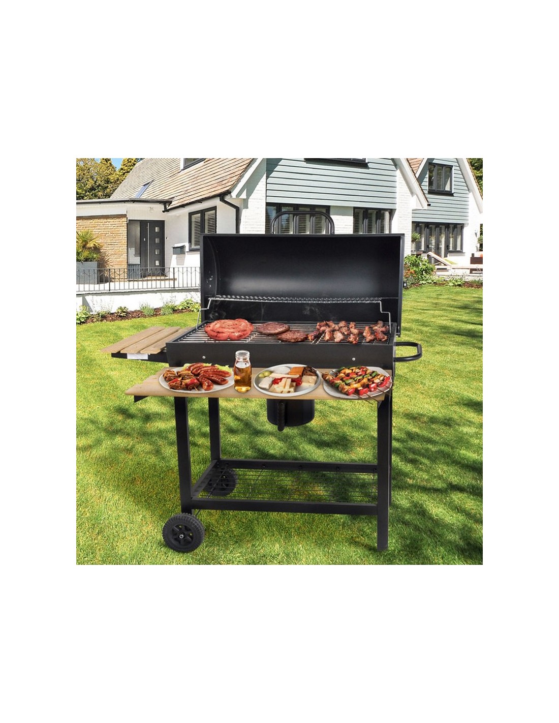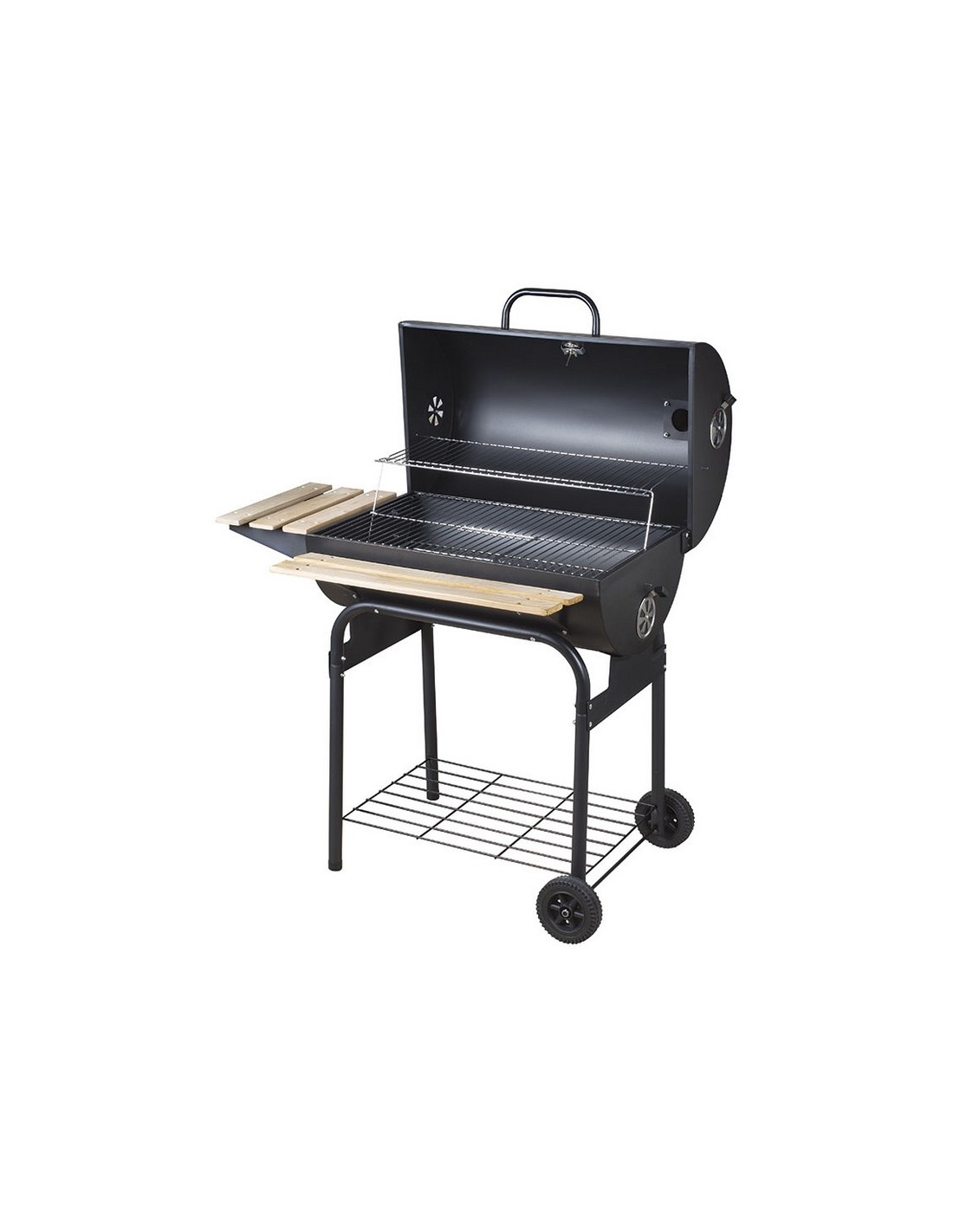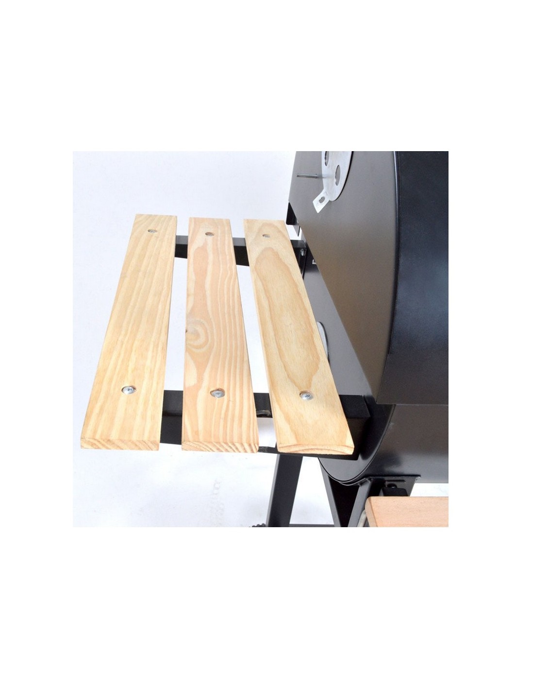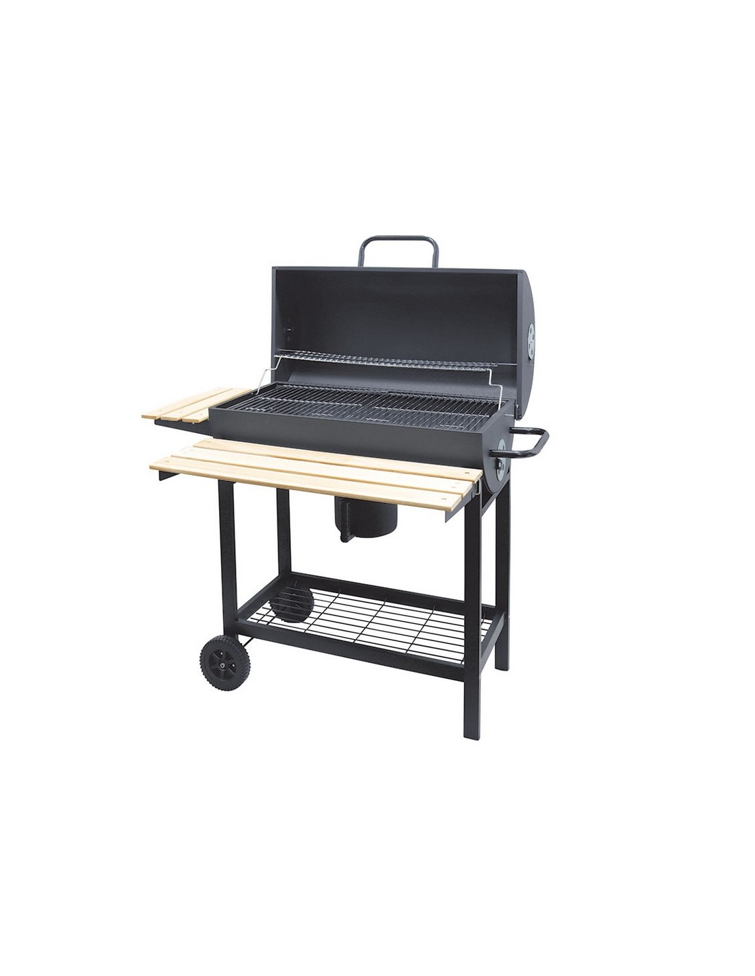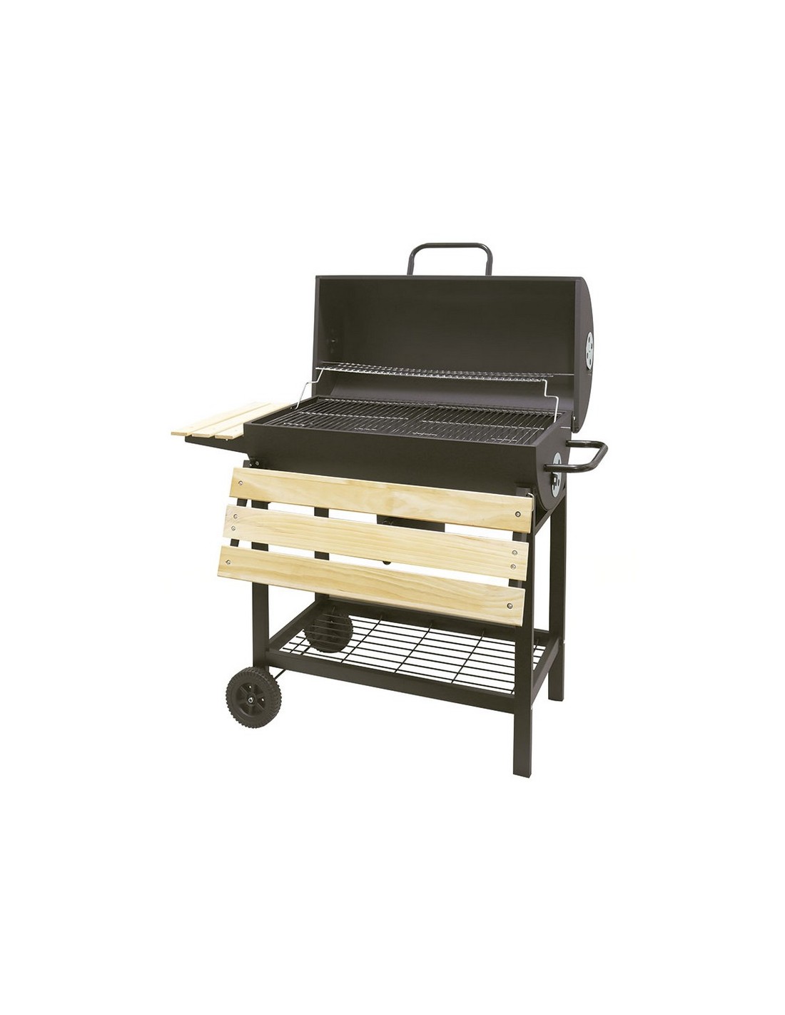 Barbacoa carbón/leña HABITEX Supergrill 70 Estructura metálica. Con tres bandejas; lateral y frontal en madera e inferior de rejilla metálica. Ruedas de transporte. Parrilla inferior: 71x37,5 cm.