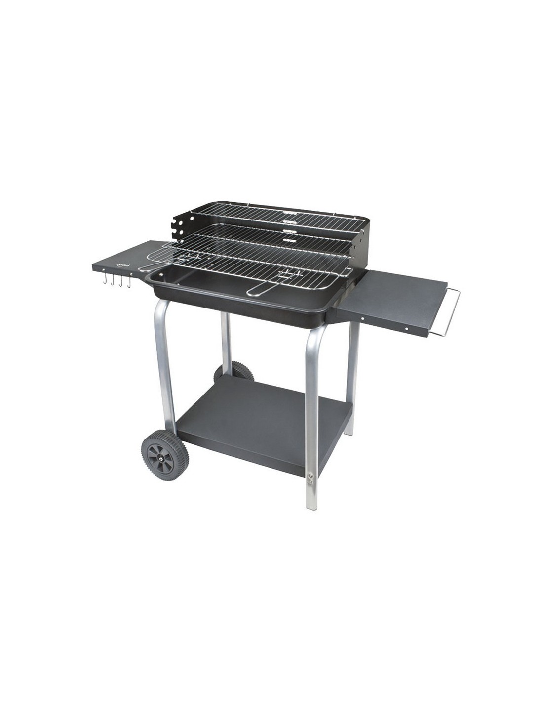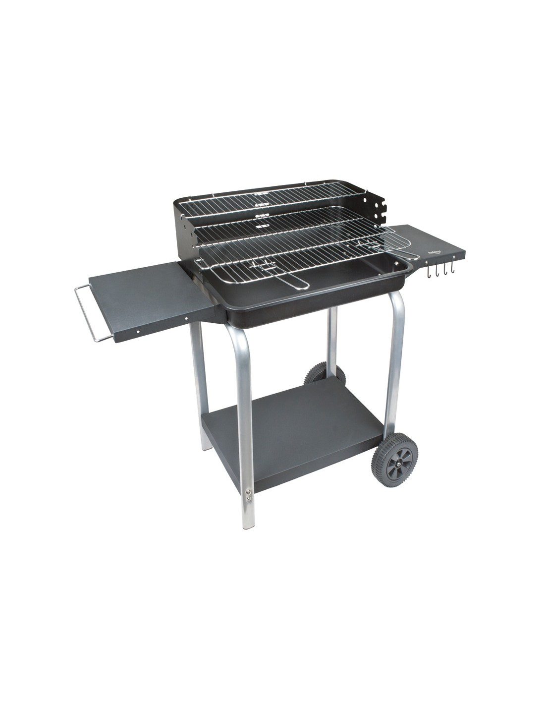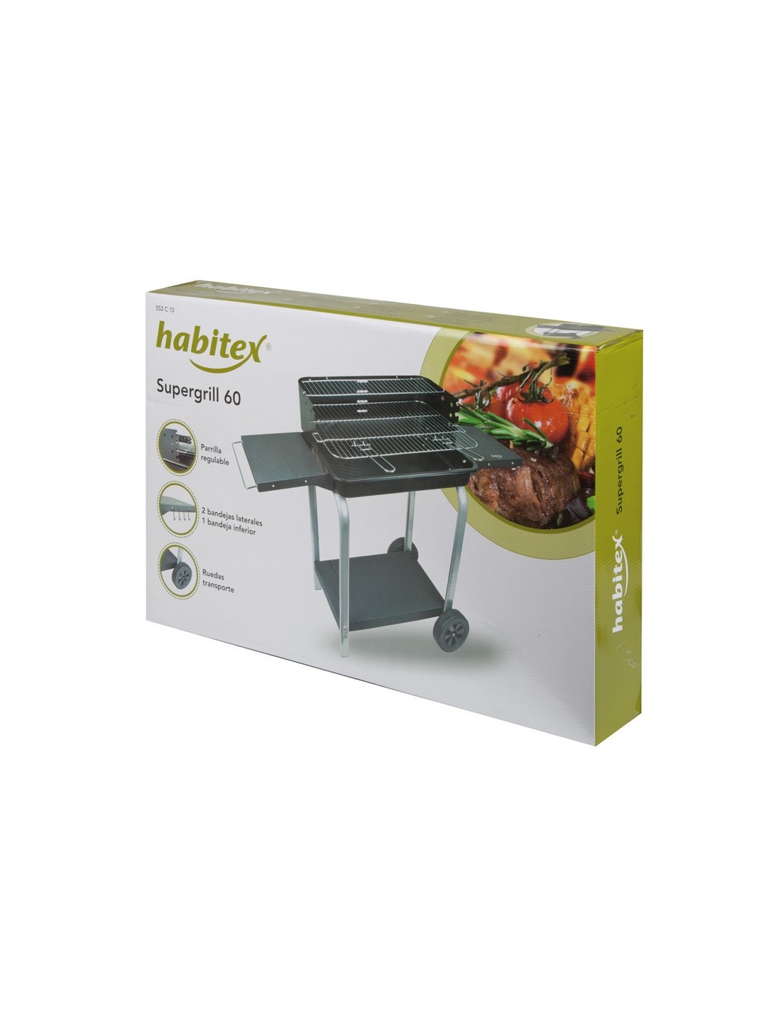 Barbacoa carbón HABITEX Supergrill 60. Estructura metálica. Cubeta acero lacado. Parrilla cromada altura regulable. 2 bandejas laterales y bandeja inferior. Ganchos para utensilios. Ruedas transporte. Parrilla: 60x37 cm.