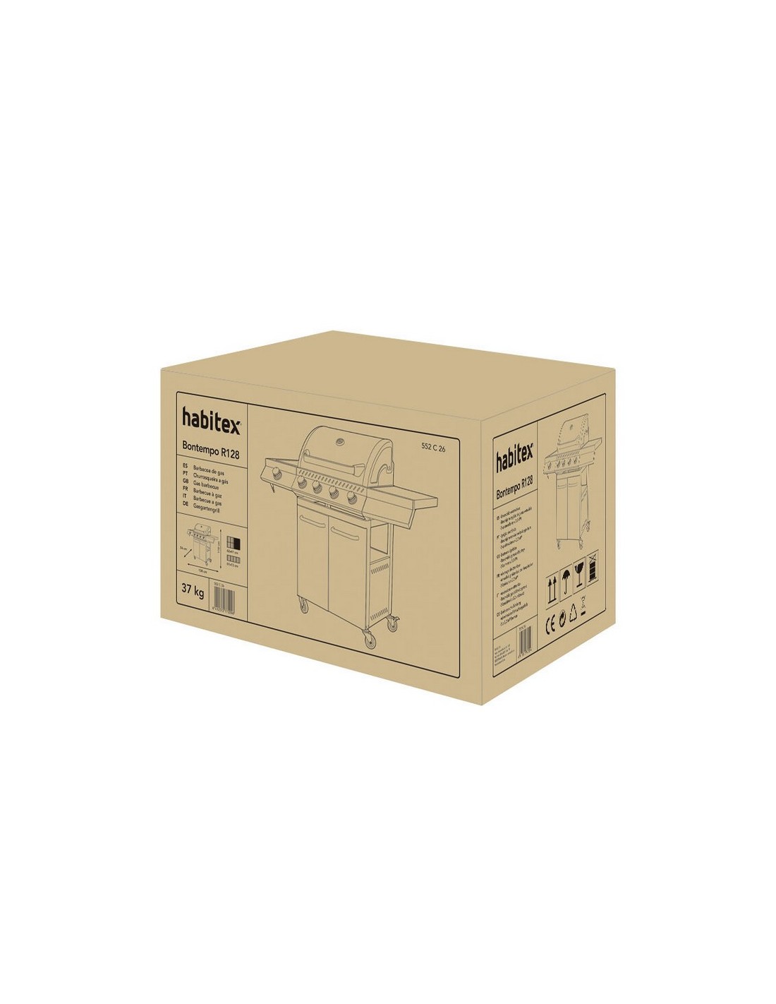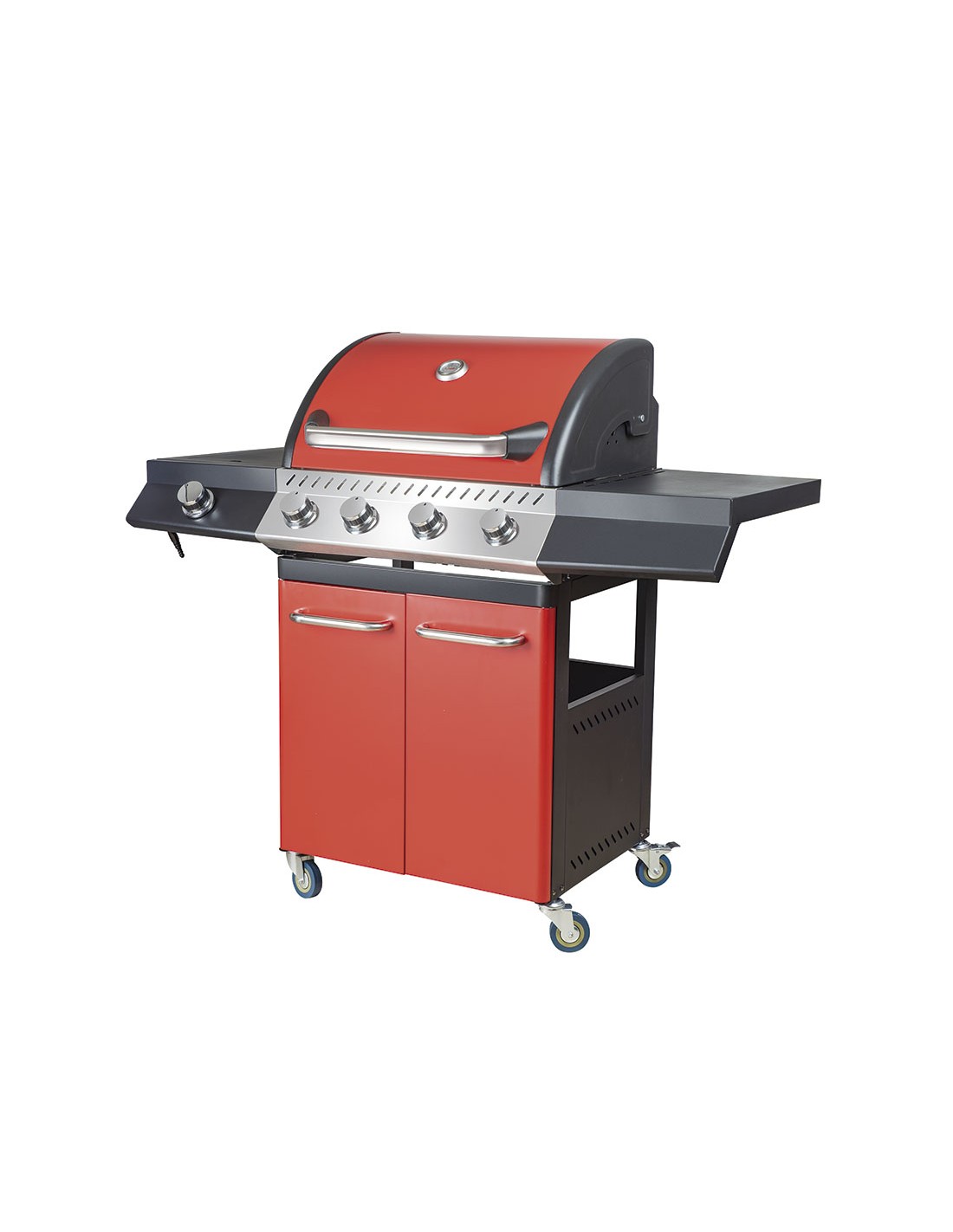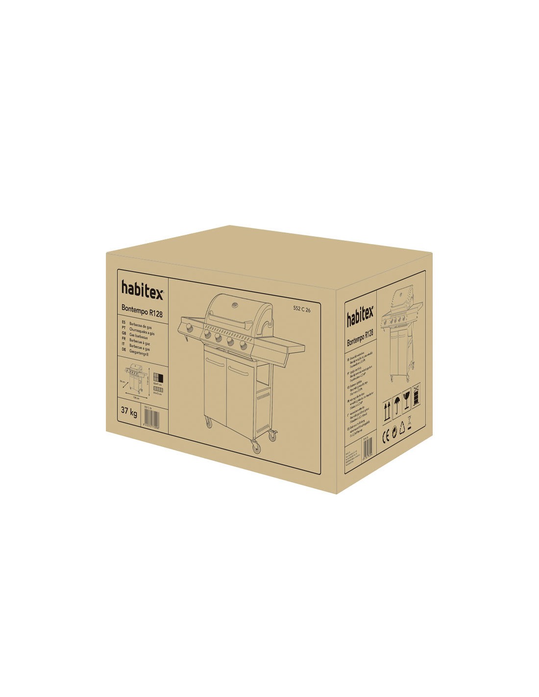 Barbacoa gas HABITEX Bontempo R128 Estructura metálica acero lacado. Plancha de acero esmaltado. Encendido electrónico. Bandeja recogida de grasa extraíble. Tapa horno con indicador de temperatura. Parrilla y plancha de acero esmaltado. Parrilla auxiliar superior para mantener los alimentos calientes. 4 quemadores de acero inox y cocina lateral. 4 ruedas transporte (2 de ellas con freno). Bandejas laterales. (Regulador y tubo de gas no incluido). Cocción: 2.542 cm².