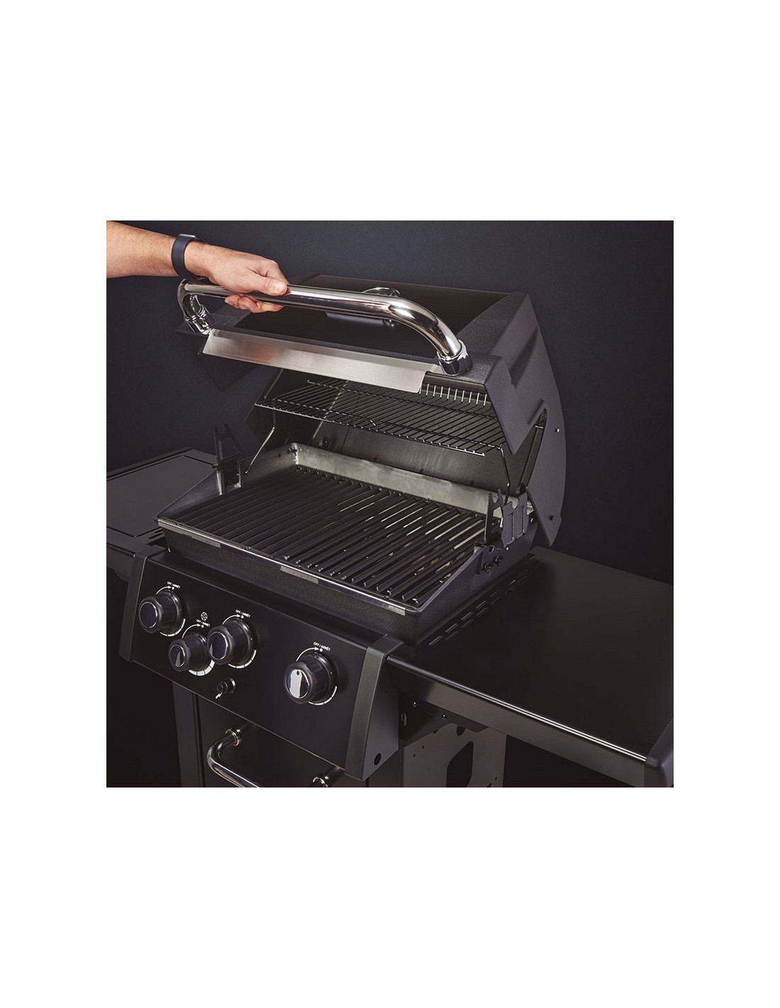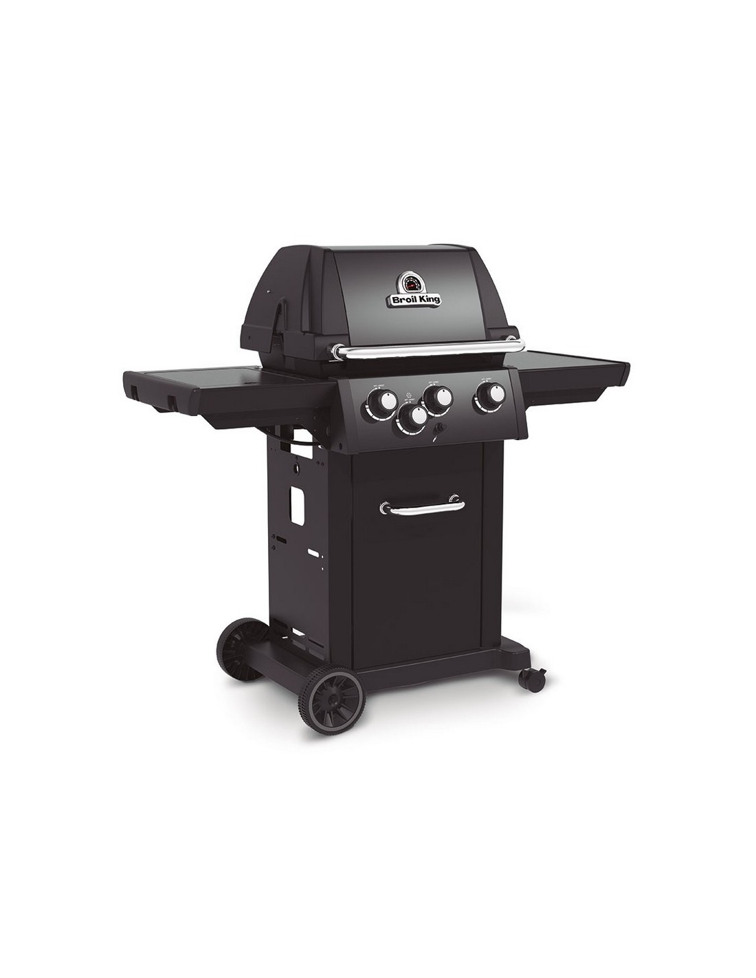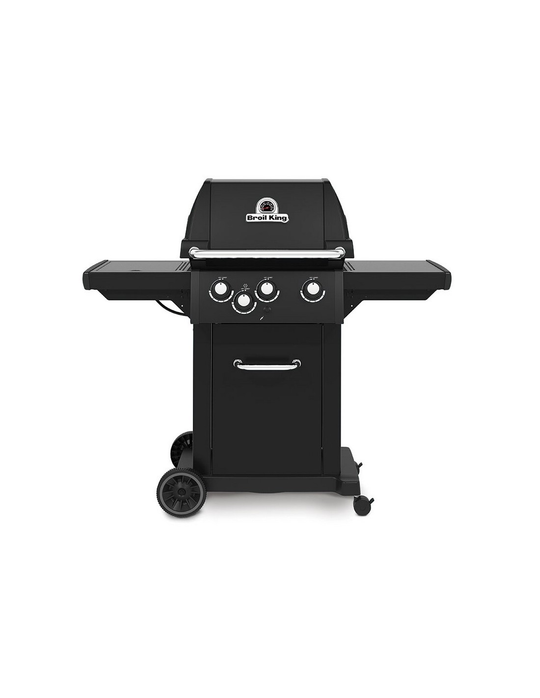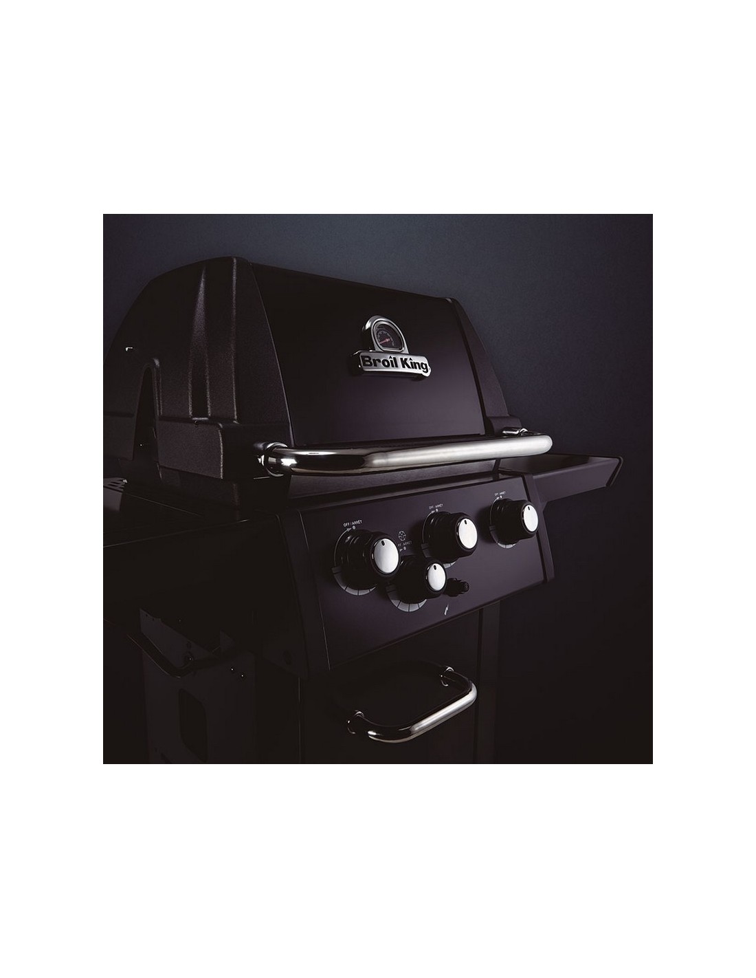 Barbacoa de gas BROIL KING Royal 340 Shadow versátil y potente, perfecta para los amantes de las parrilladas. Su contrucción es robusta fabricada con materiales de alta calidad para una durabilidad extendida y resistencia. Los estantes laterales, las puertas, el panel de control y la manilla del horno están fabricados en acero inoxidable y recubiertoscon una elegante pintura en polvo negra. Dispone de quemador lateral para que puedas hacer salsas, caramelizar cebolla entre otros mientras cocinas la carne, pescado o verduras. El encendico es electrónico Sure-Lite, en una fracción de segundo, con solo presionar el botón. Destaca por su eficiencia energética de 8,98 W distribuidos en tres quemadores de tubo en acero inoxidabe, ofreciendo un calentamiento rápido y uniforme. Dispone de una amplia superficie de cocción de 56x38 cm, ideal para cocinar una gran variedad de alimentos.