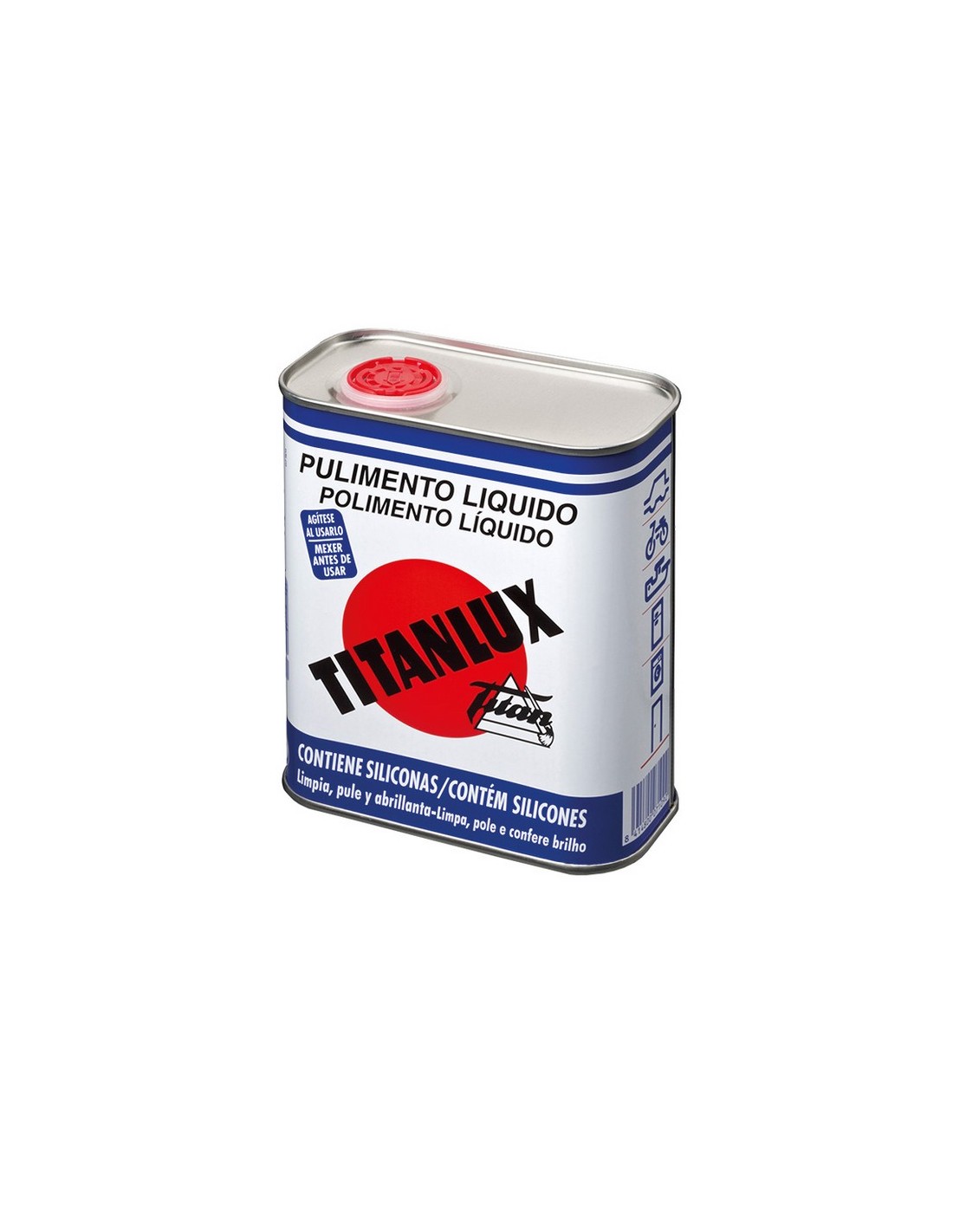 Pulimento líquido TITANLUX Contiene siliconas que repelen el agua, la suciedad y el polvo; hidrofugan las superficies pintadas, lacadas o barnizadas y les aumentan la resistencia al rayado. De gran rendimiento y fácil aplicación. 750 ml.