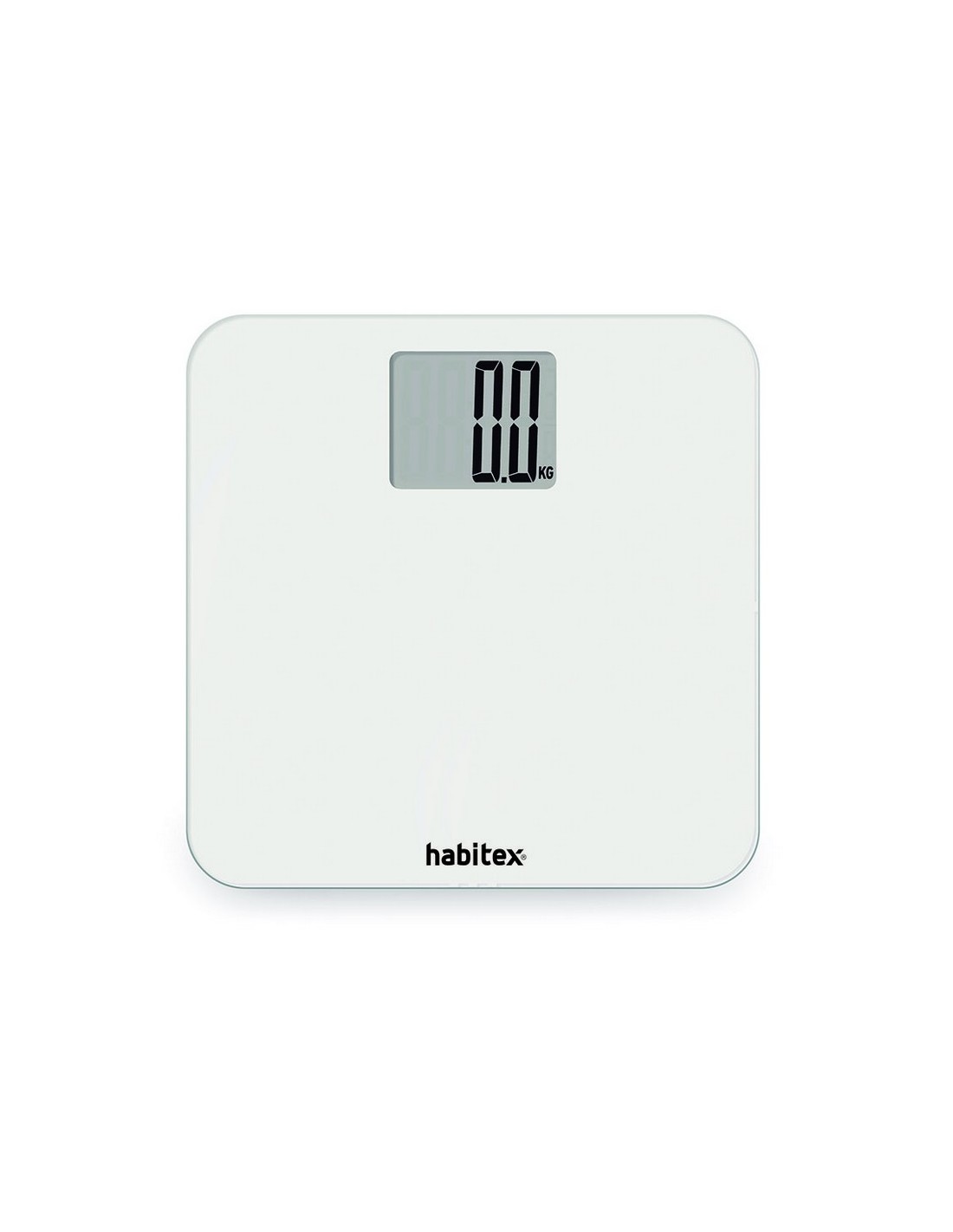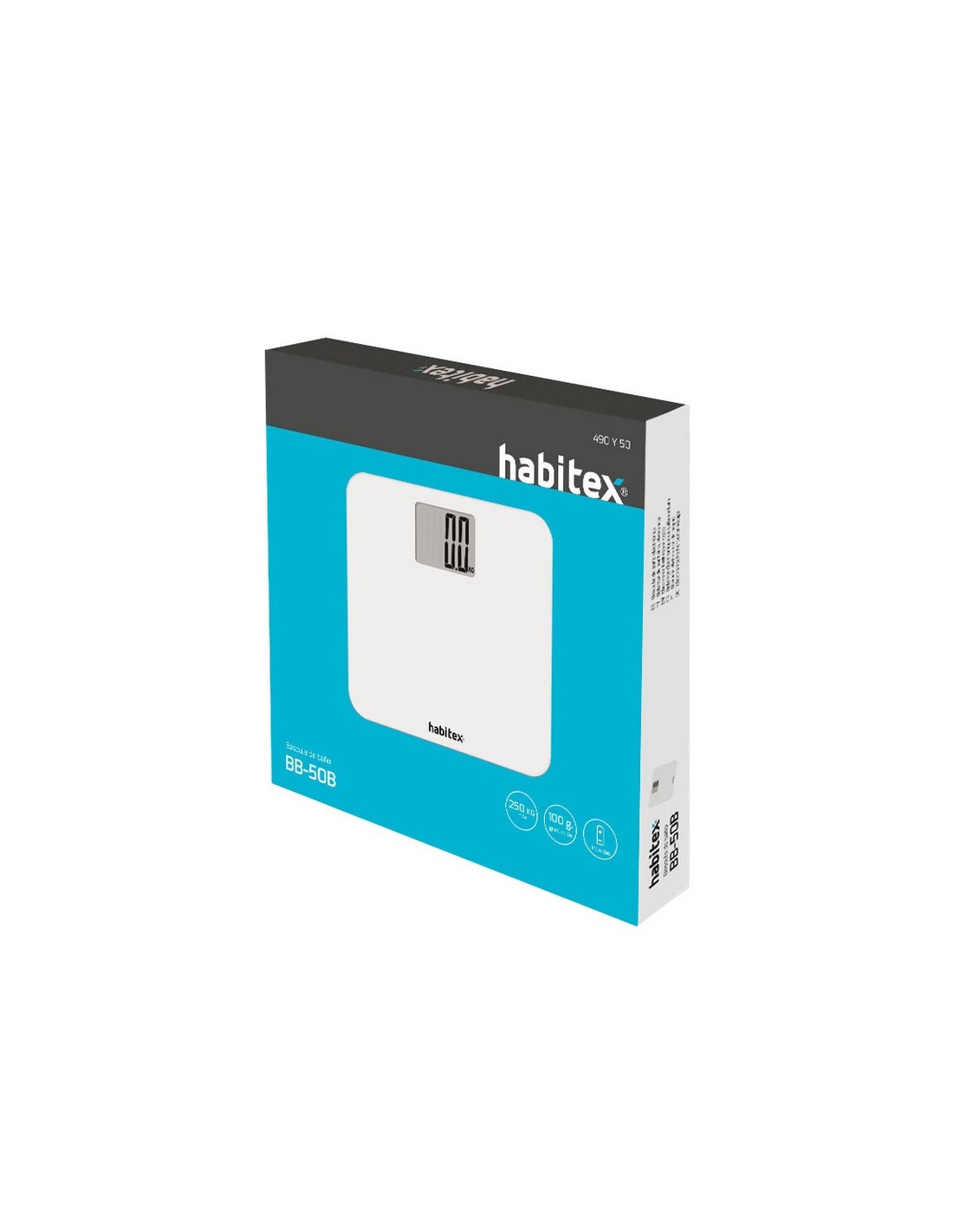 Báscula baño HABITEX BB-50B Electrónica. Plataforma de cristal templado de 6 mm. Color blanco. Display LCD extragrande 77x93 mm. Desconexión automática. Indicador de sobrecarga y batería baja. Funciona con 3 x AAA (LR03) incluidas. Peso máx: 250 kg.