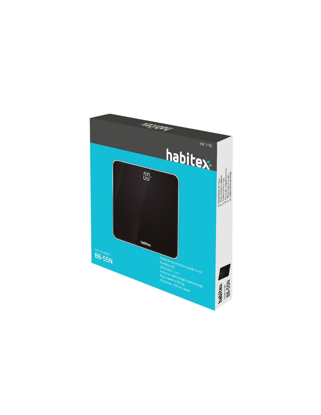 Báscula baño HABITEX BB-55N led Electrónica. Plataforma de cristal templado de 6 mm. Color negro. Display Led digital 33x78 mm. Desconexión automática. Indicador de sobrecarga y batería baja. Funciona con 3 x 1,5 V AAA (LR03) incluidas. Peso máx: 180 kg.