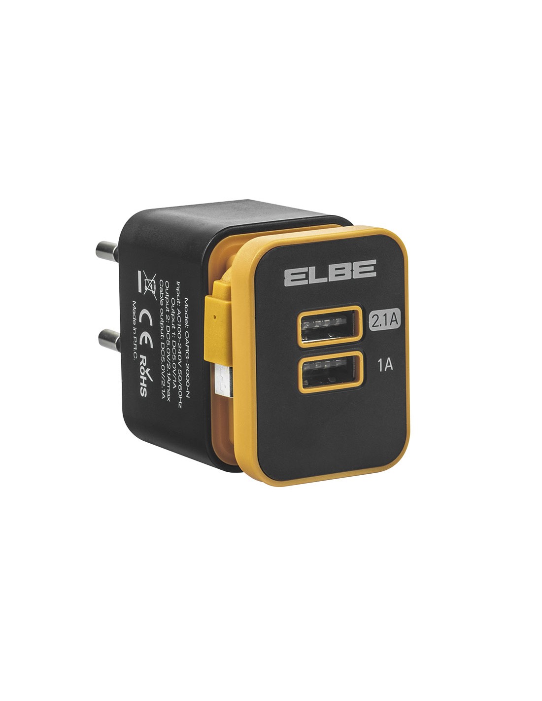 Cargador USB de pard Elbe 2XUSB + micro USB 3 soluciones de carga diferentes, dos salidas USB, una de 2,1A de carga rápida, otra de 1A de carga normal y una tercera mediante su cable de carga Micro USB. Peso: 33 gr. \r\nDimensiones: 3.5x4.6xh.4.9 cm.