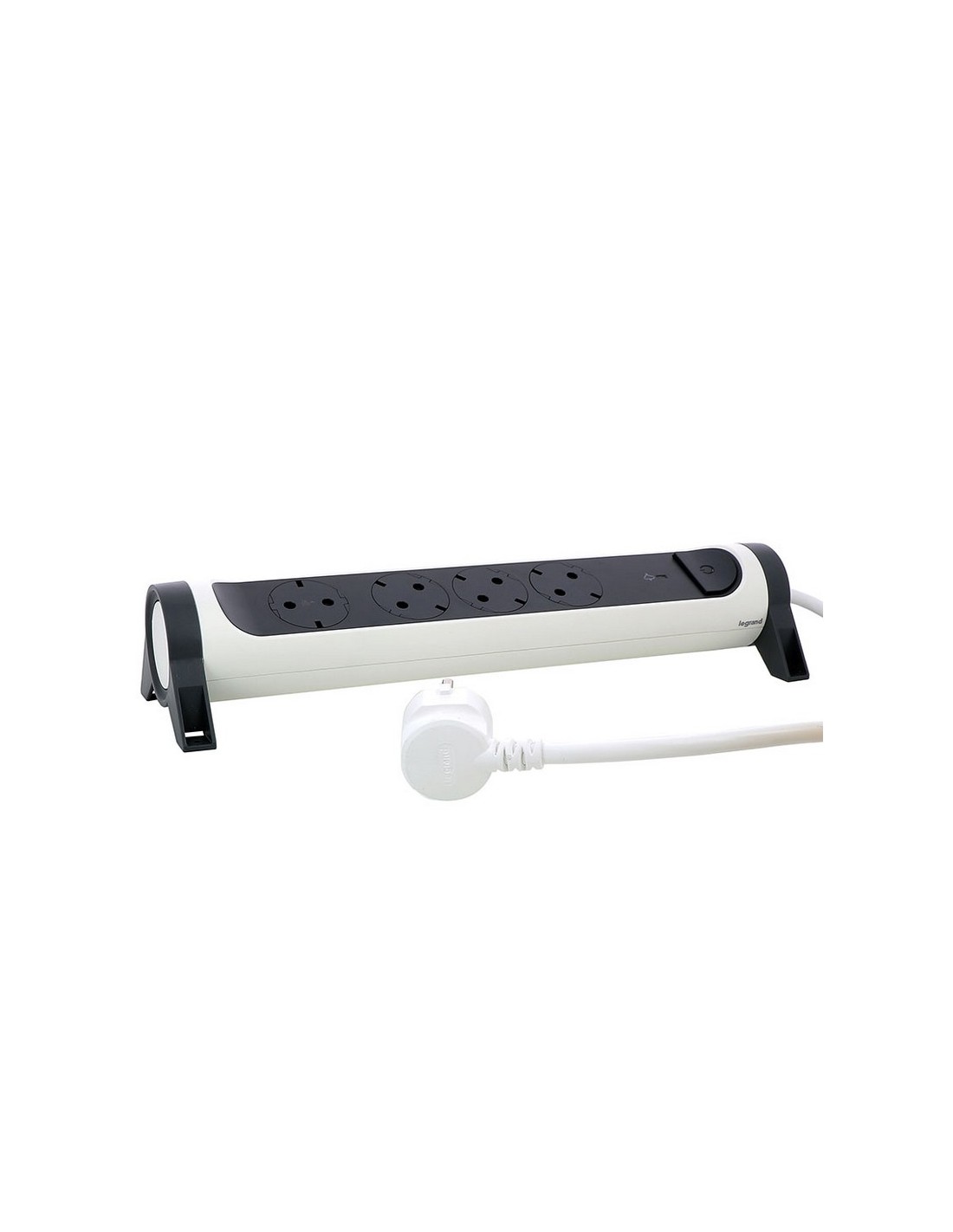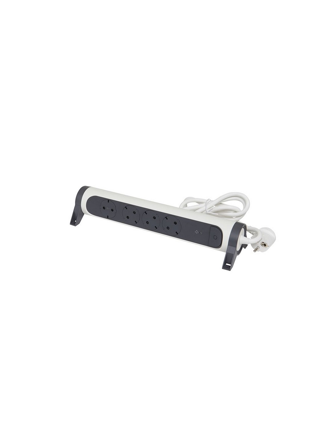 Base enchufe múltiple LEGRAND Fija y giratoria. 16 A a 230 V y potencia máx. 3.680 W. Interruptor ON/OFF. Protección sobretensiones. Una toma está orientada para evitar bloqueos de otras tomas al conectar. Diseño exclusivo. Cable 1,5 m. 4 tomas. Blanco y gris oscuro.