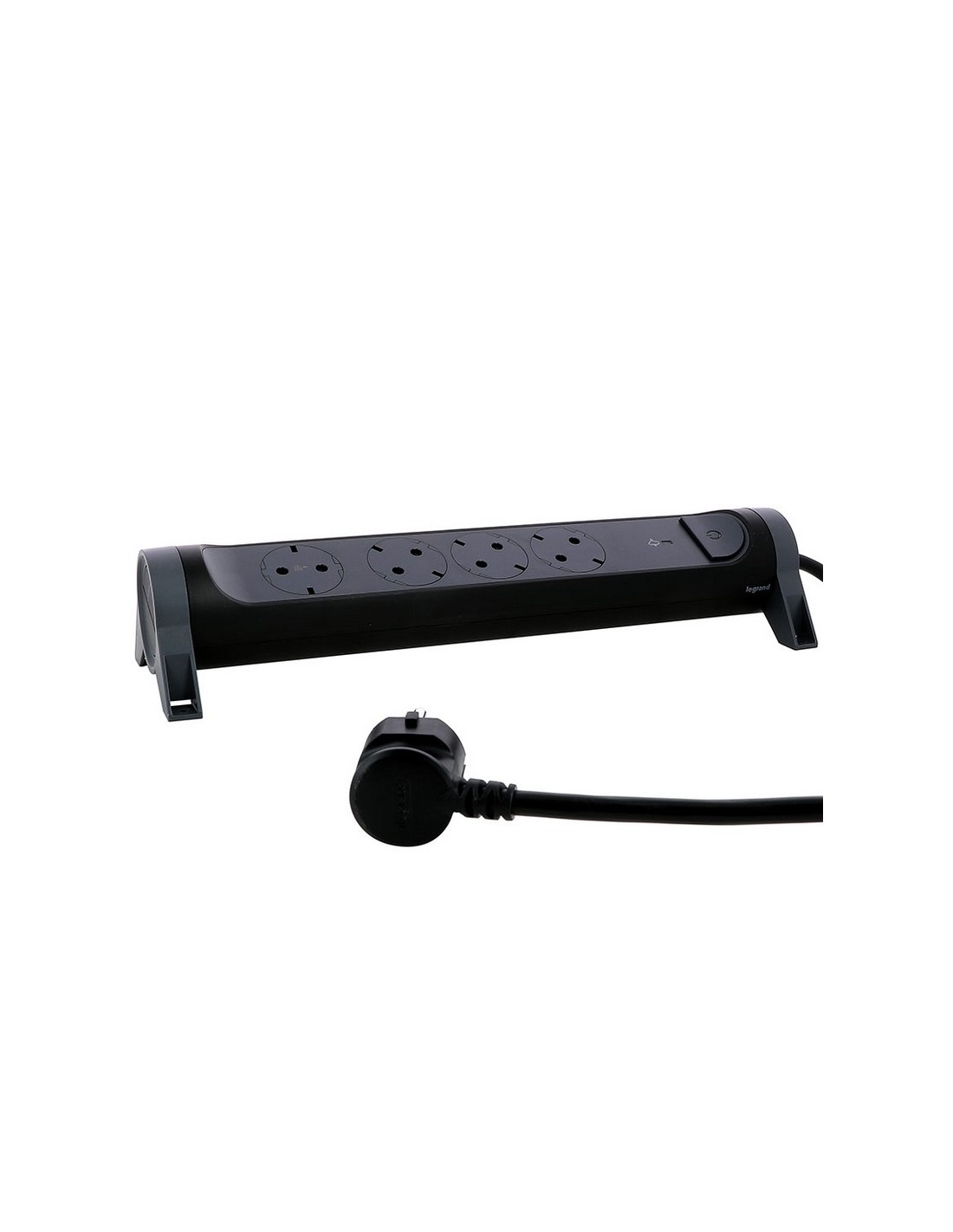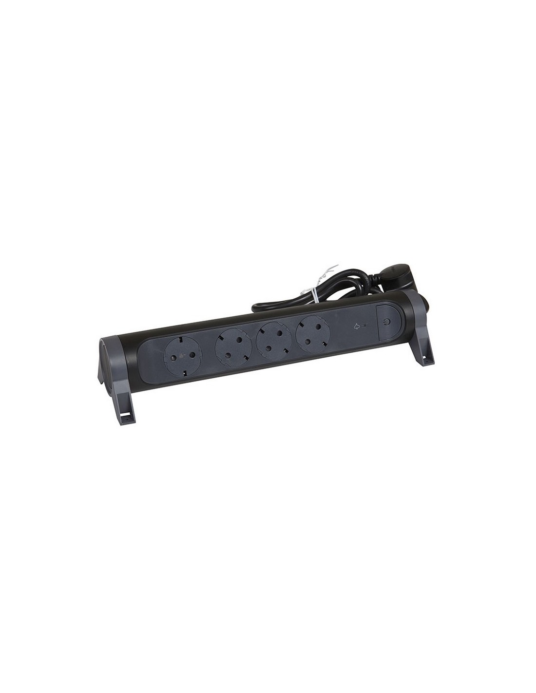 Base enchufe múltiple LEGRAND Fija y giratoria. 16 A a 230 V y potencia máx. 3.680 W. Interruptor ON/OFF. Protección sobretensiones. Una toma está orientada para evitar bloqueos de otras tomas al conectar. Diseño exclusivo. Cable 1,5 m. 4 tomas. Negro y gris oscuro.