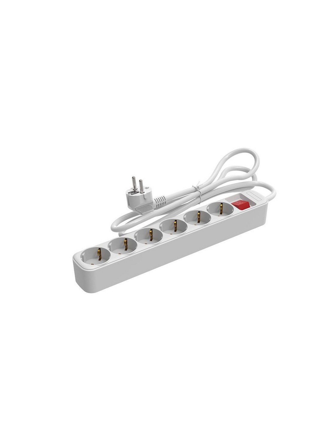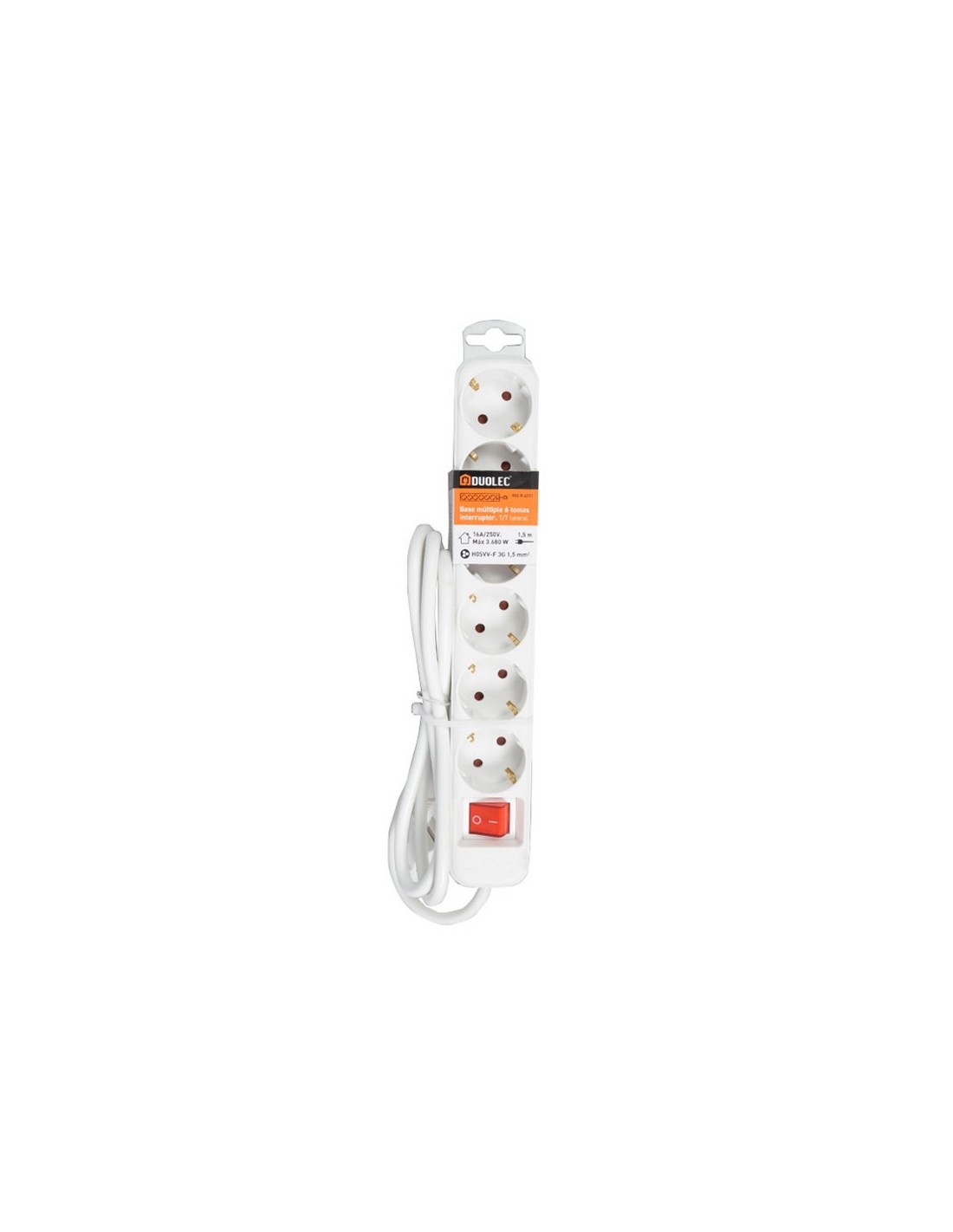 Base enchufe múltiple DUOLEC con cable T/T lateral. 16 A / 250 V. Con interruptor. 6 tomas. Blanco. Cable 1,5 m.