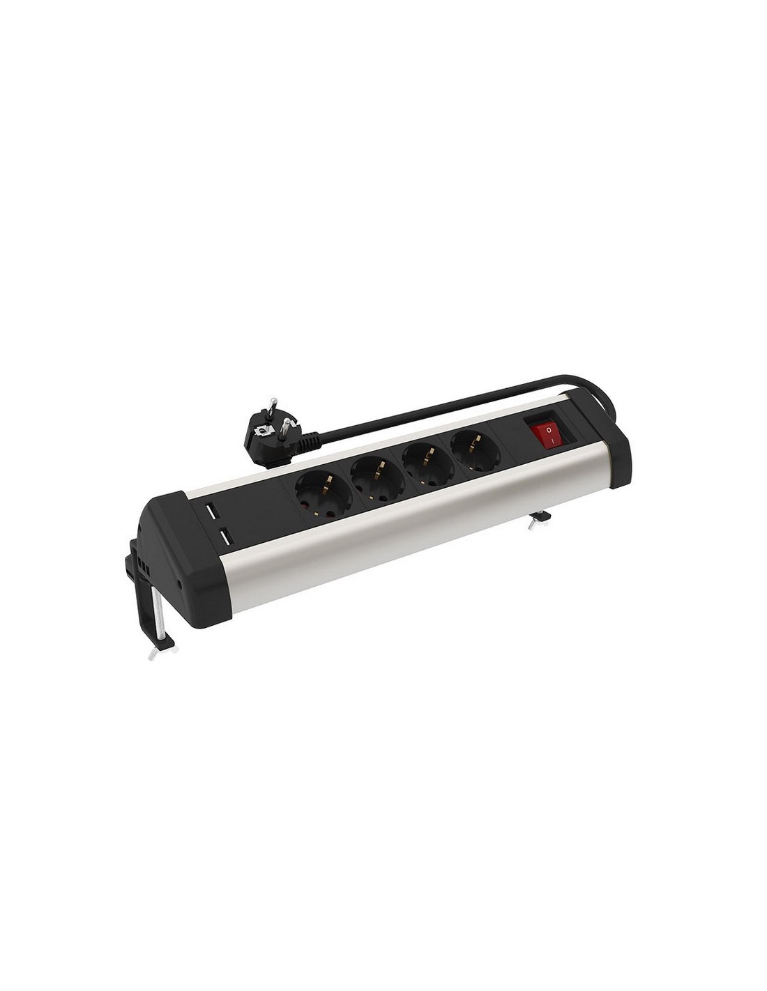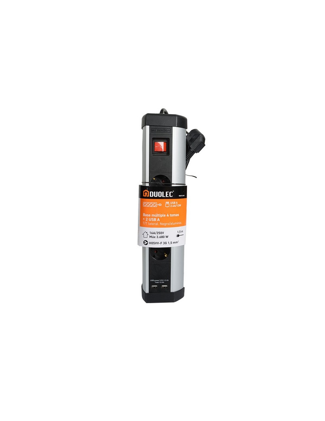 Base enchufe múltiple en aluminio DUOLEC. Cable 1,5 m. T/T lateral. 16 A. 250 V. Potencia máx. 3.680 W. Protección sobretensión . 2 entradas USB. 4 tomas. Negro.