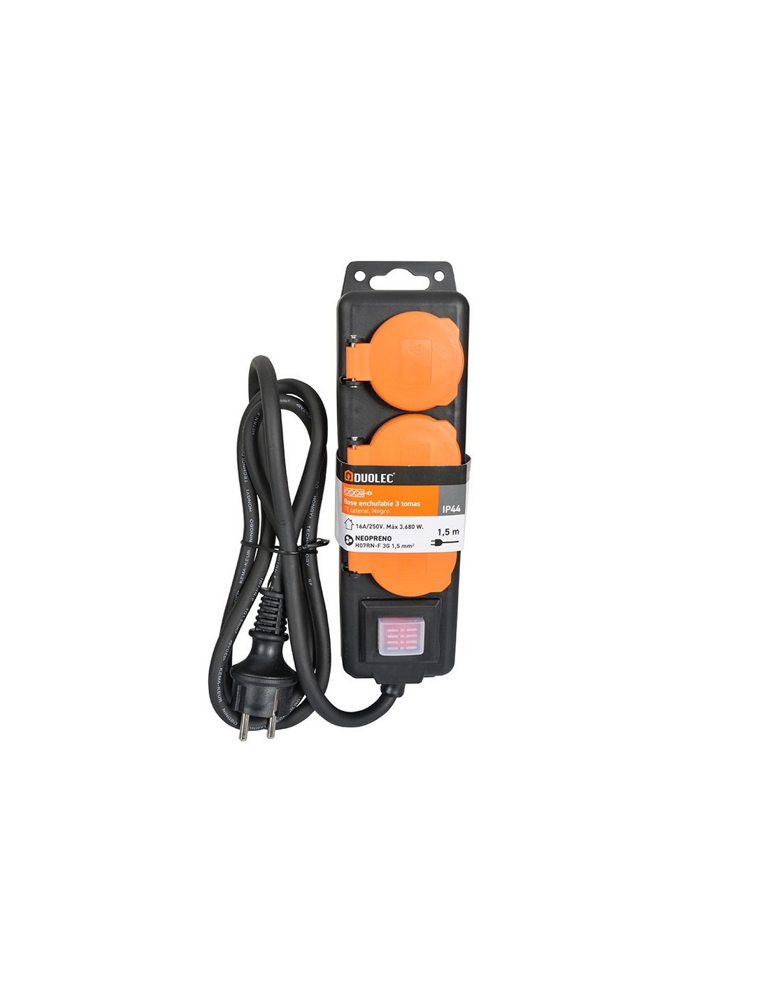 Base enchufe múltiple exterior DUOLEC IP44 Cable 1,5 m. T/T lateral. IP44. Color negro. Tomas protegidas. 3 tomas.