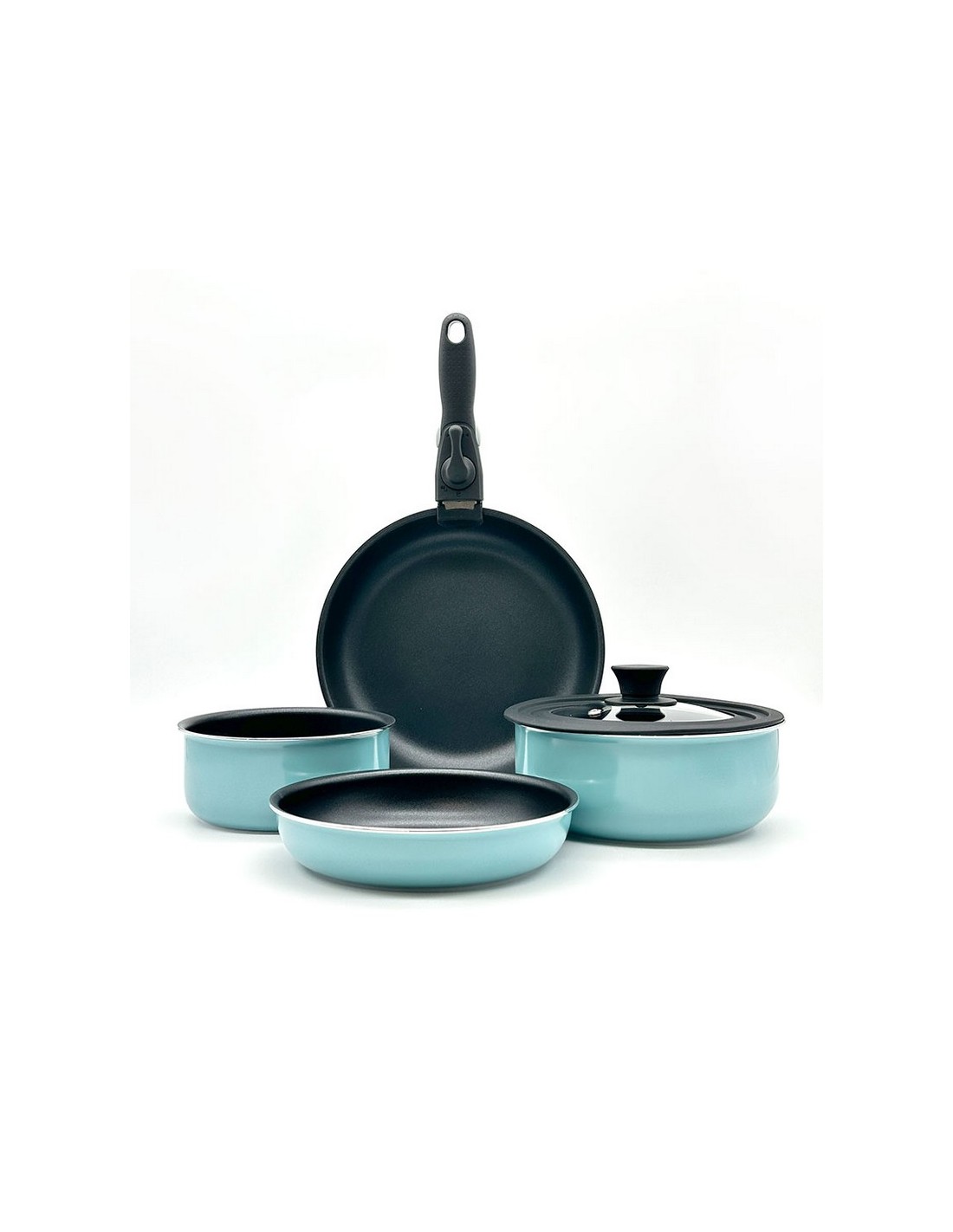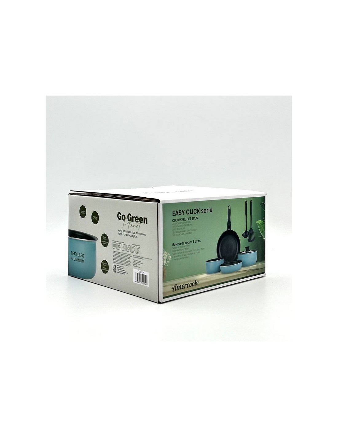 Batería cocina 8 piezas Amercook EasyClick Aluminio alta calidad. Con mango extraíble de color azul cielo. Apta todo tipo de cocinas. Puede utilizarse en horno y freidoras de aire. Incluye tapa y utensilios de cocina. Incluye 2 cacerolas, 2 sartenes, tapa multitamaño, mango removible y pack de espátula y cucharón. 2 cacerolas ø 16 y 20 cm.