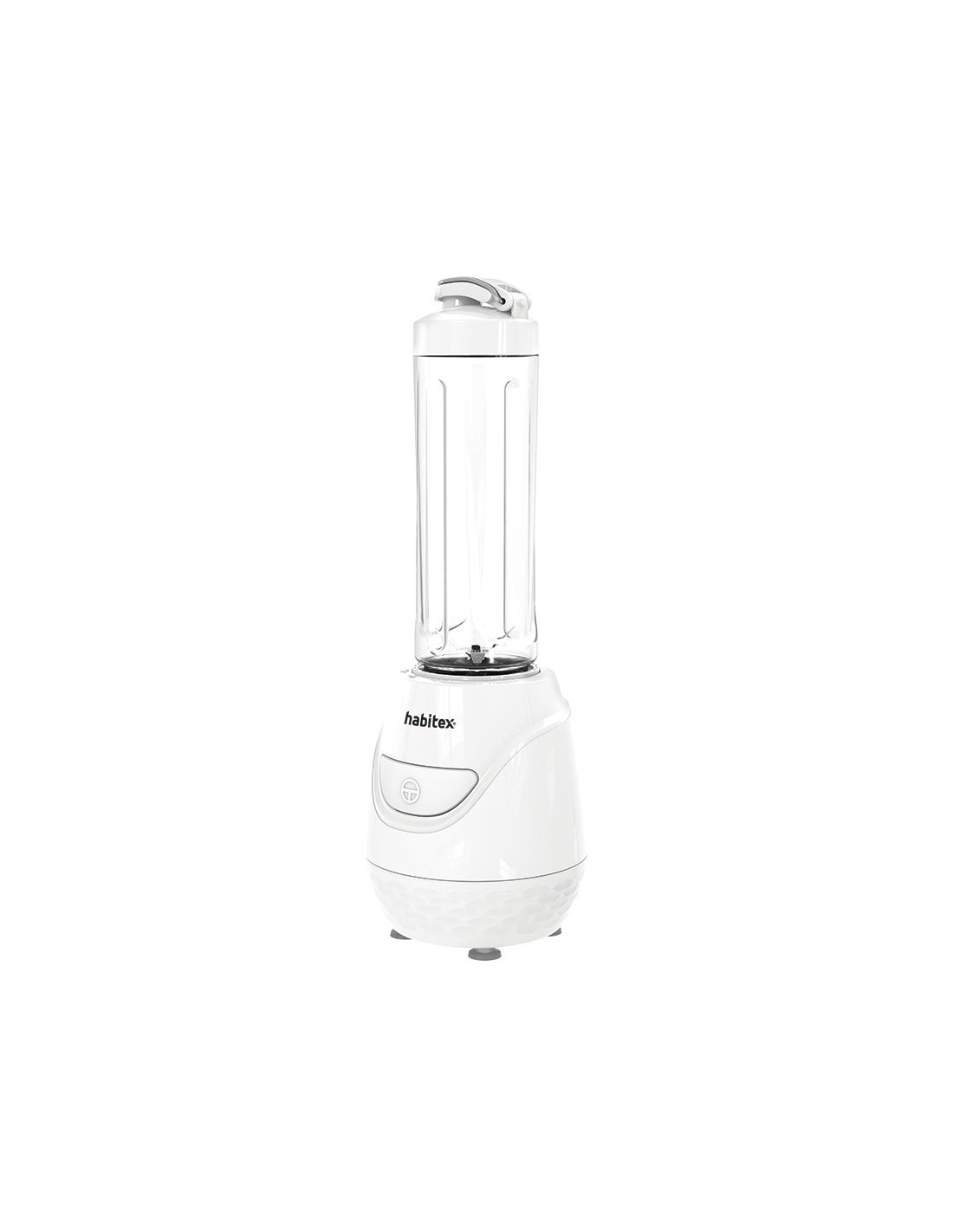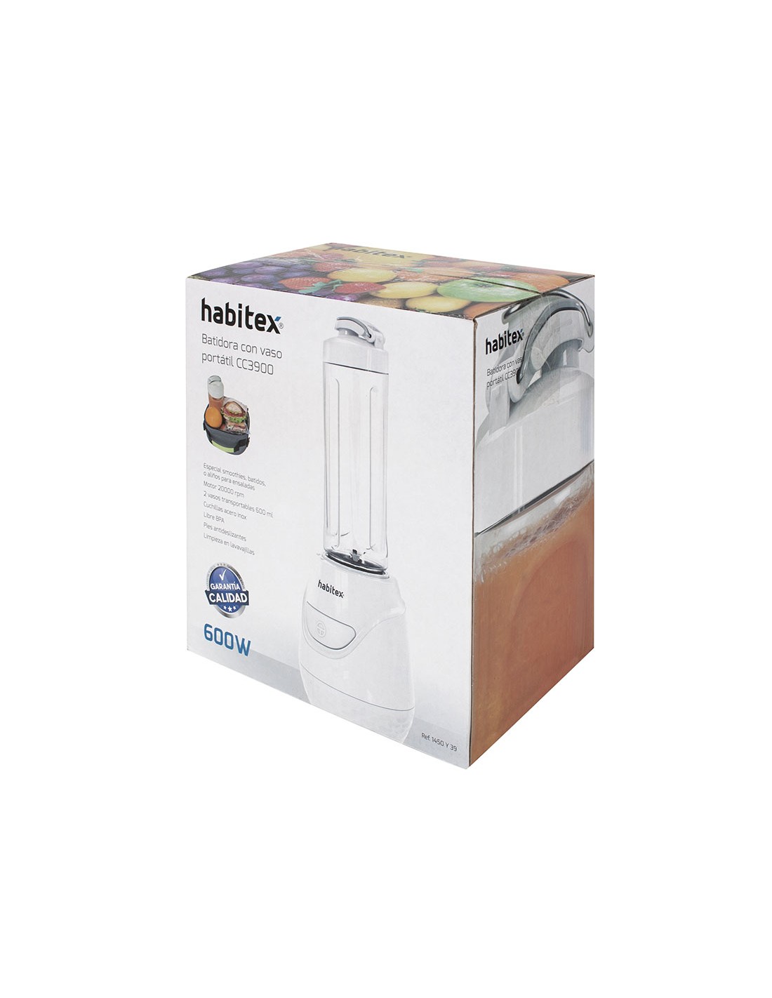 Batidora de vaso individual HABITEX CC3900. Cuchillas en acero inox. Incluye 2 vasos de plástico de 600 ml. libres de BPA y una tapa de transporte. Pies antideslizantes. Especial smoothies, batidos, aliños para ensaladas... Apto para lavavajillas. Potencia: 600 W.