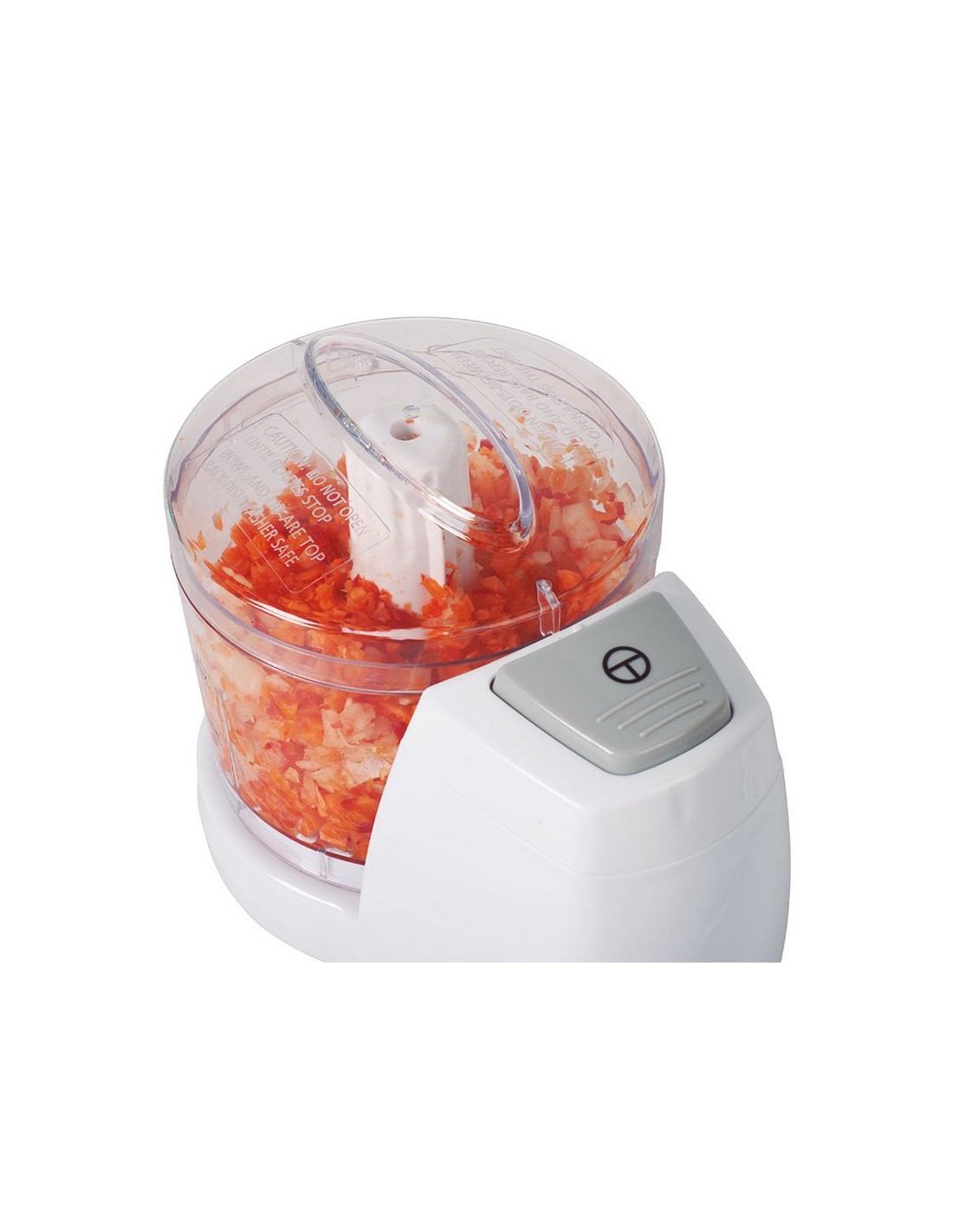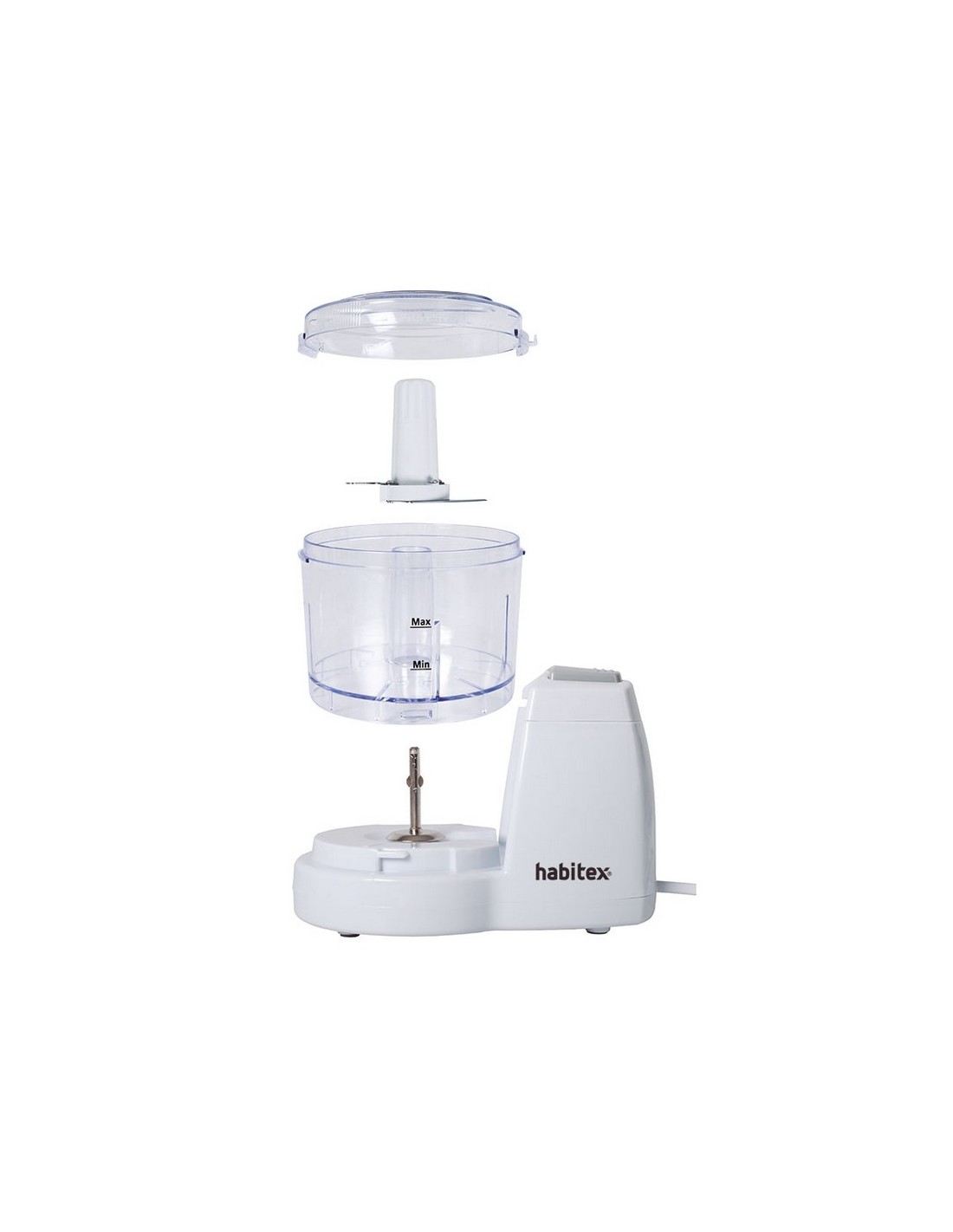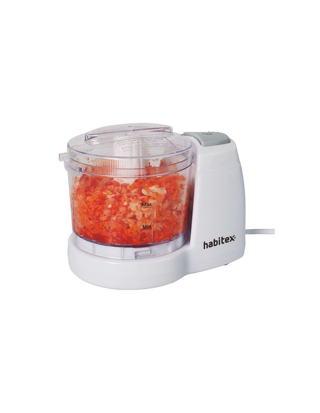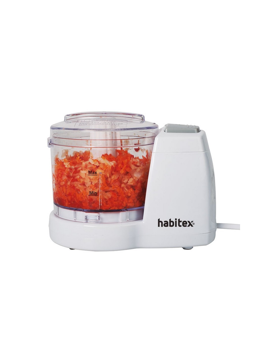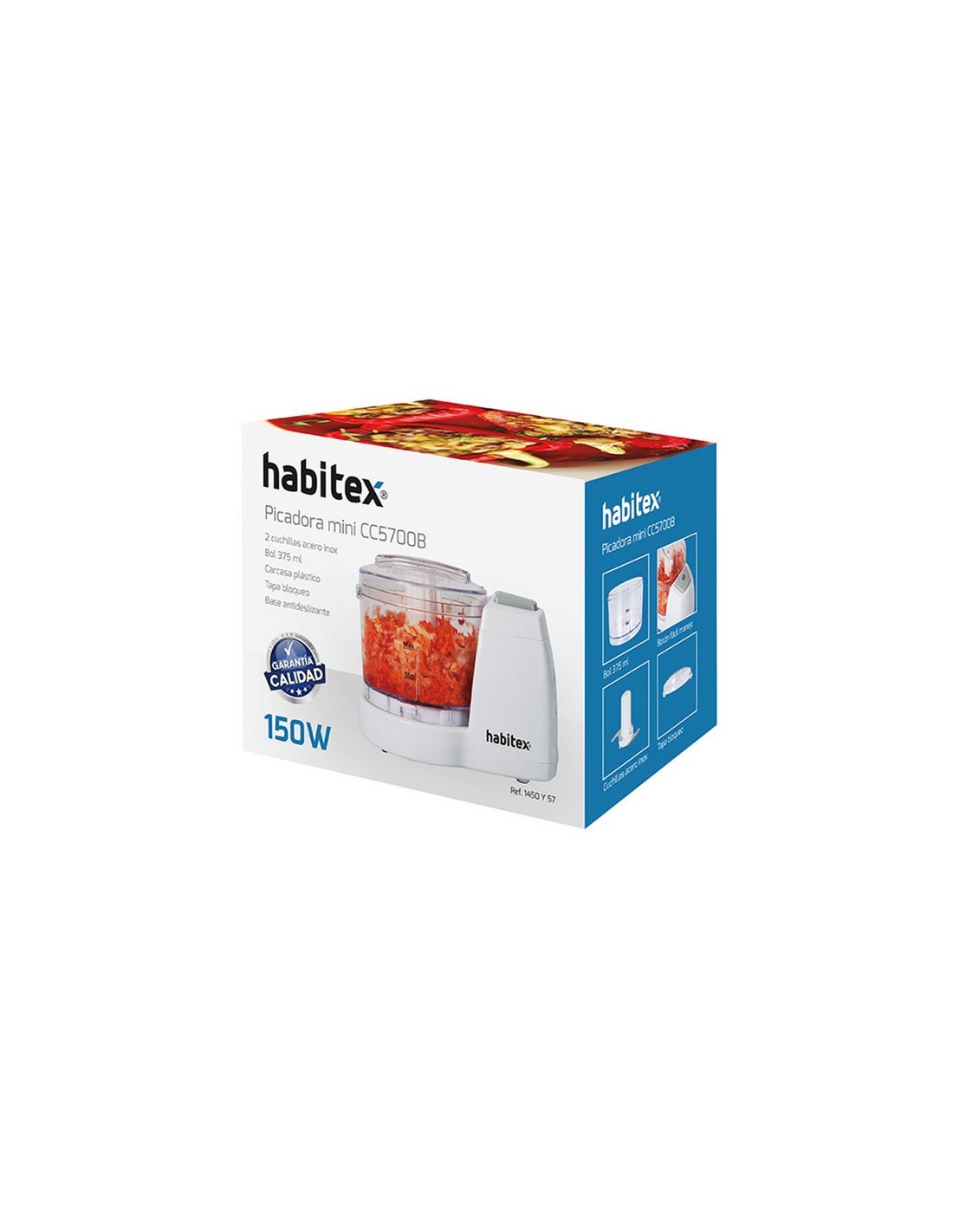 Picadora HABITEX Mini CC5700B 2 cuchillas acero inox extraíbles. Bol de plástico de 375 ml. Carcasa de plástico. Tapa desmontable. Sistema con cierre de seguridad. Base antideslizante. Potencia: 150 W.