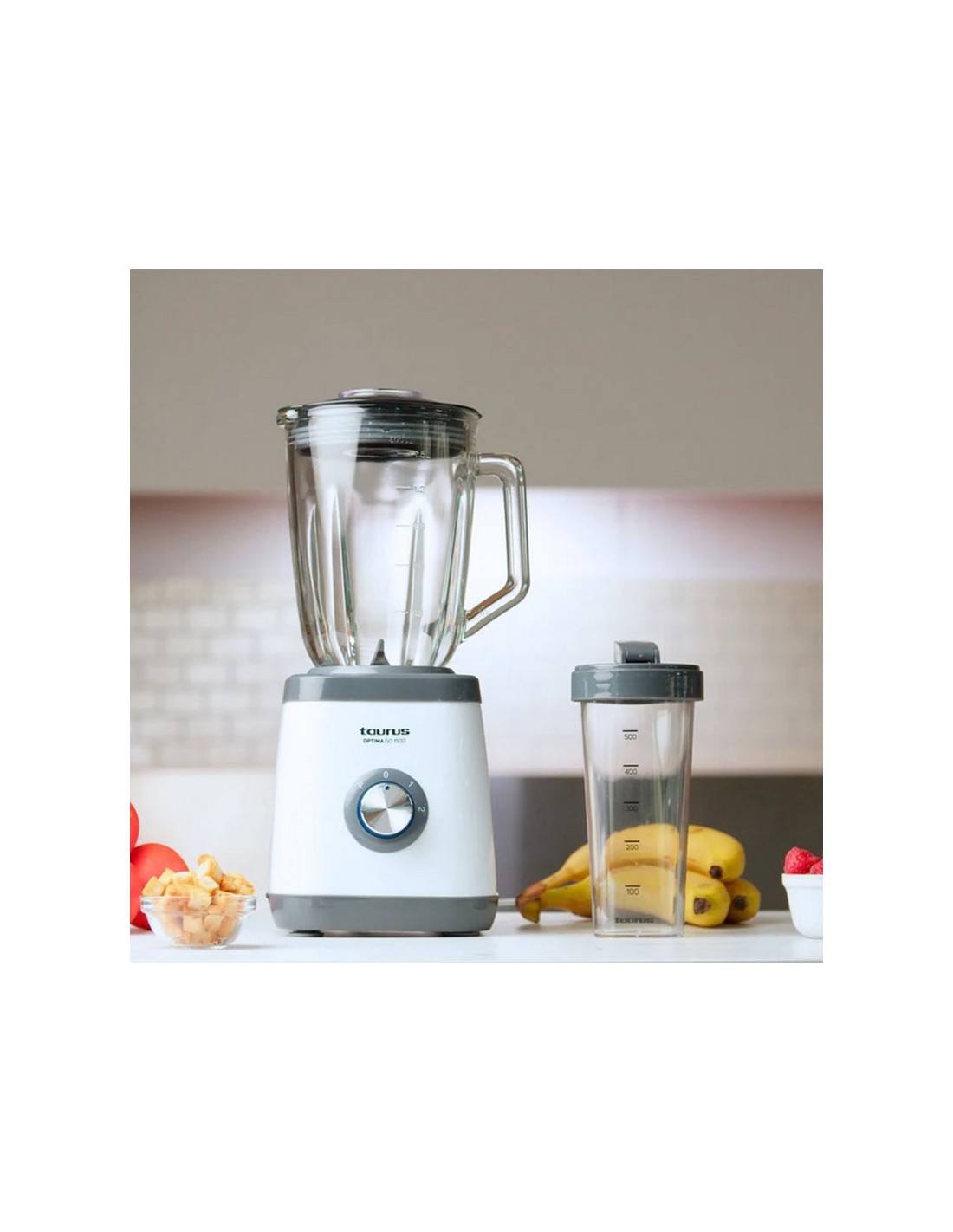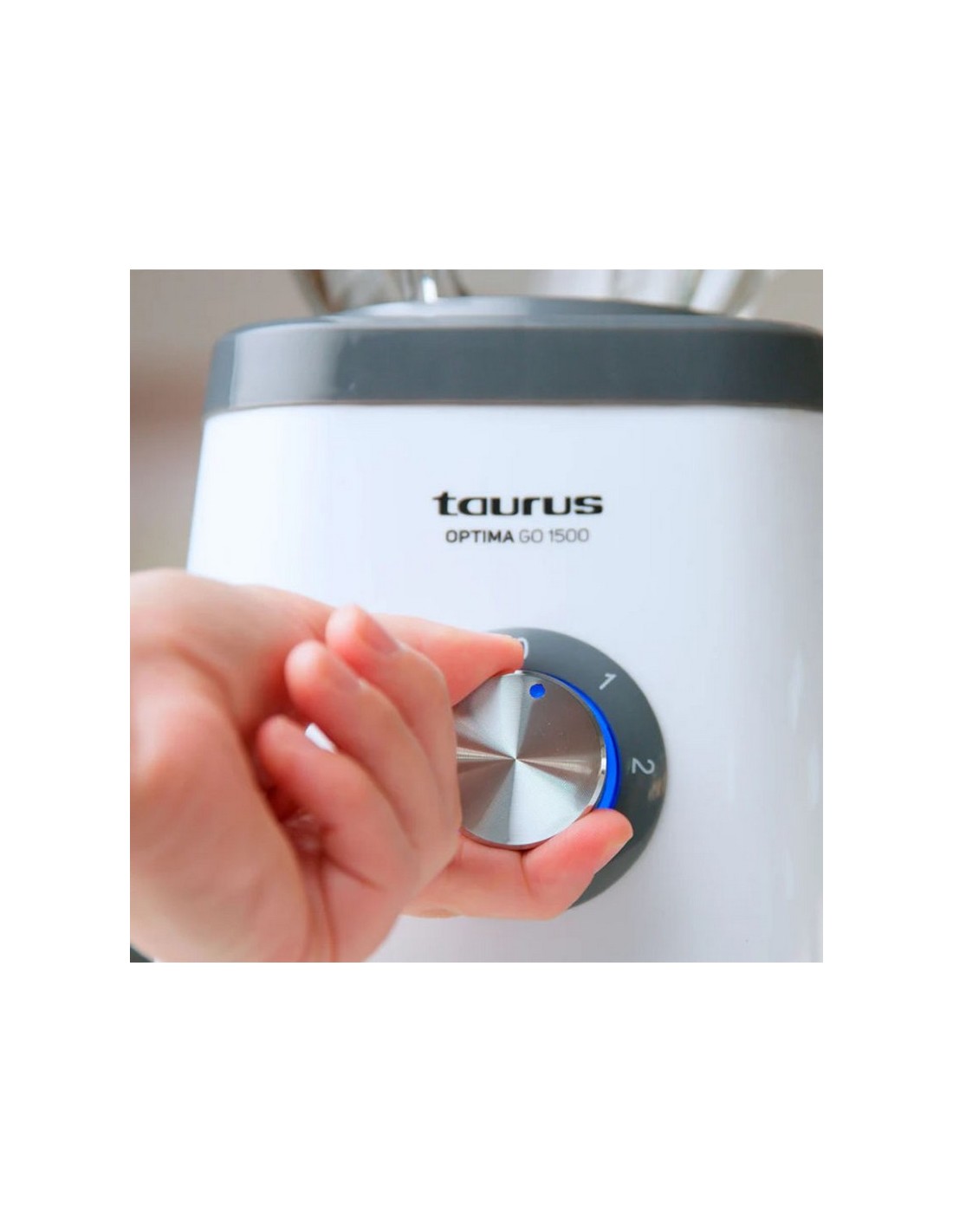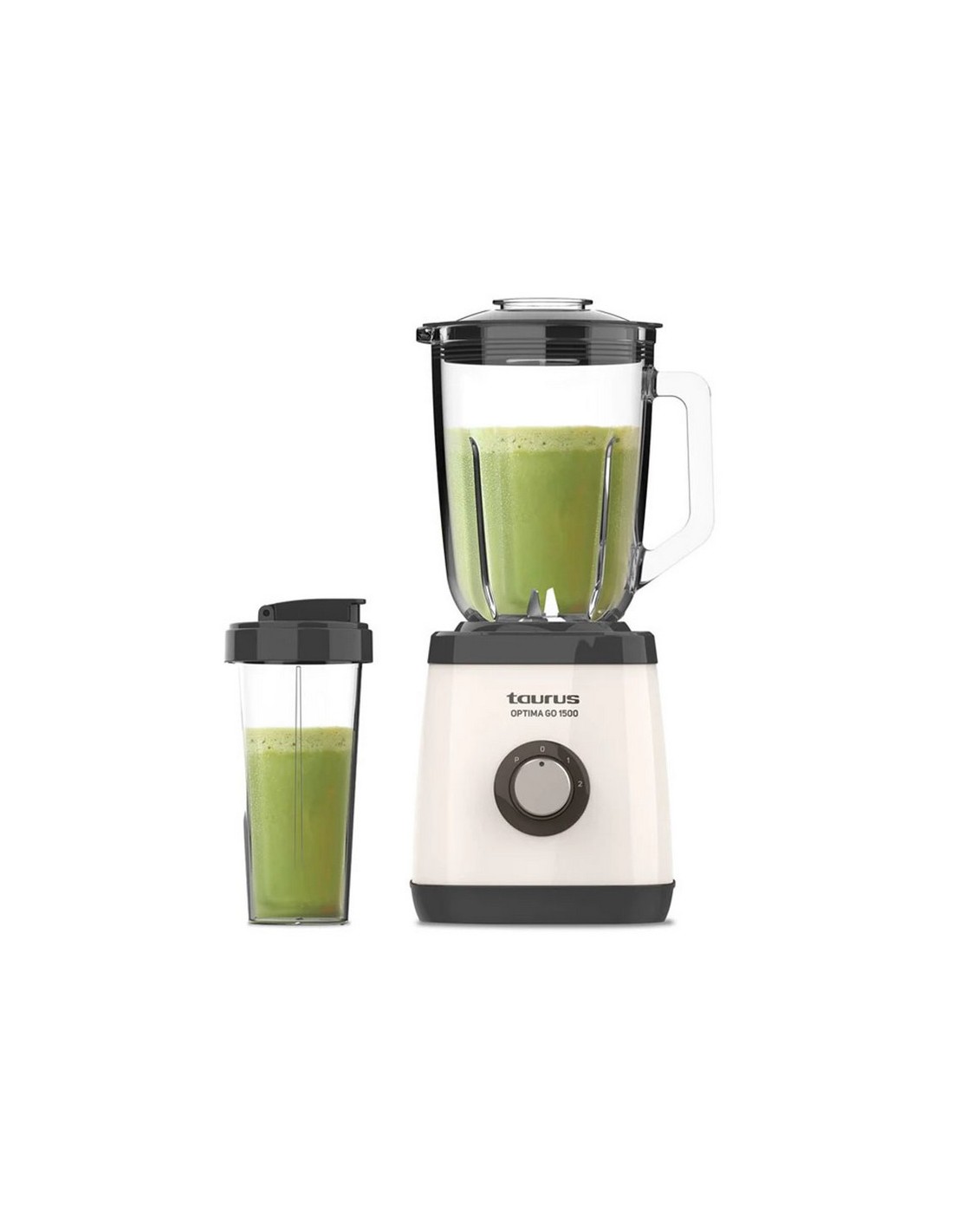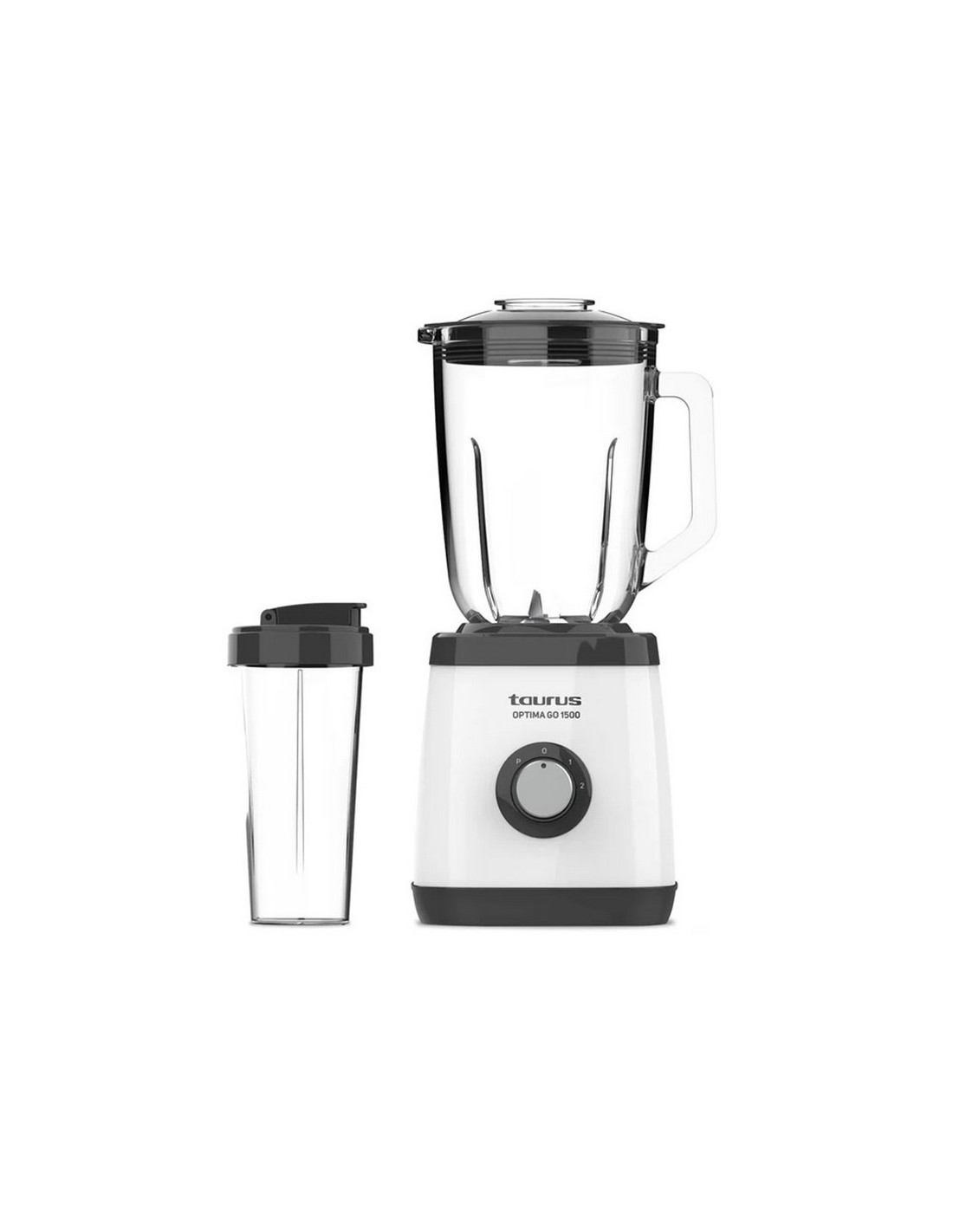 Batidora de vaso TAURUS Ootima Go 2 velocidades + función turbo. Cuchillas de 4 filos de acero inoxidable. Jarra de cristal graduada y apta para lavavajillas. Vaso hermético para transportar tus batidos. 1.500 W.