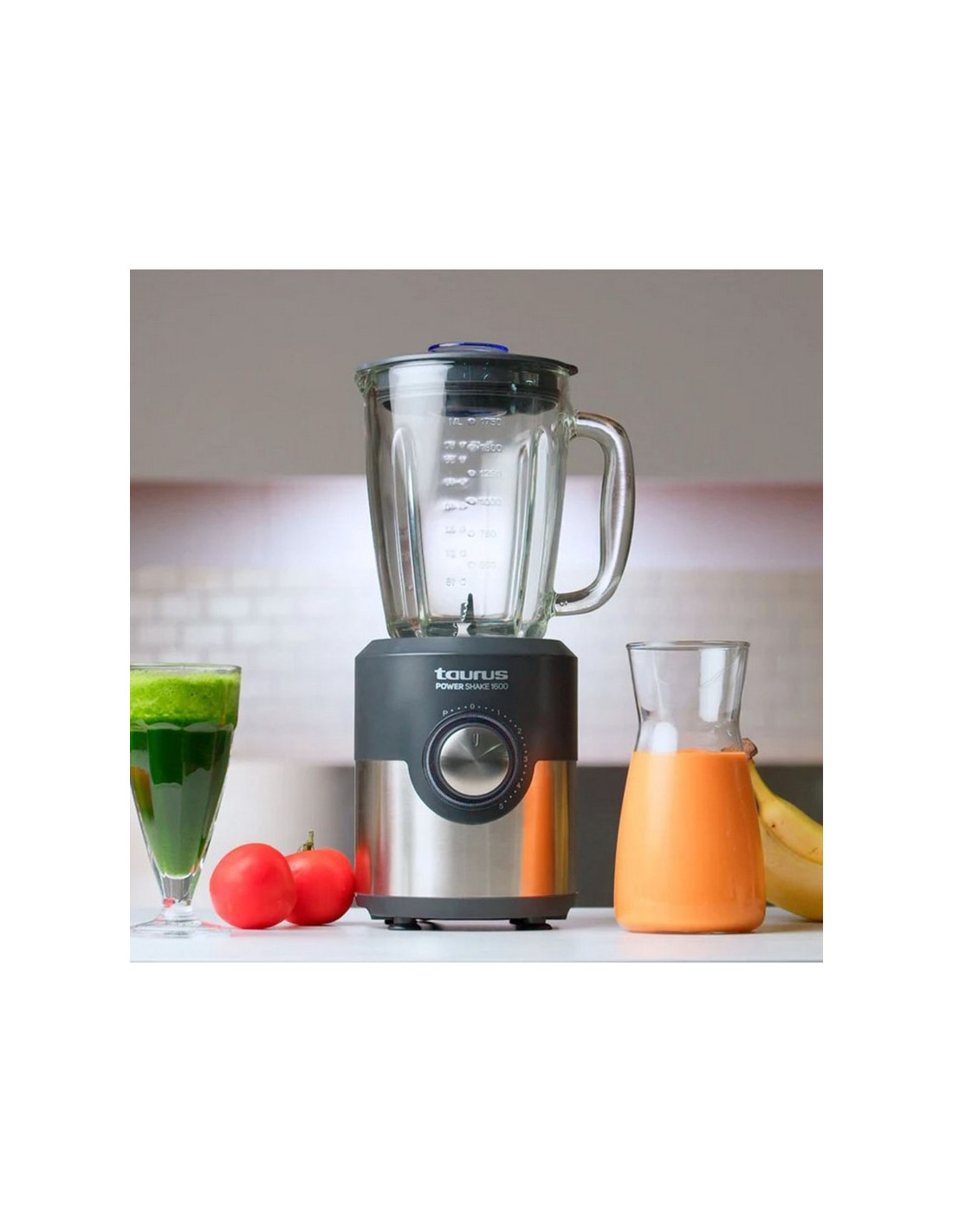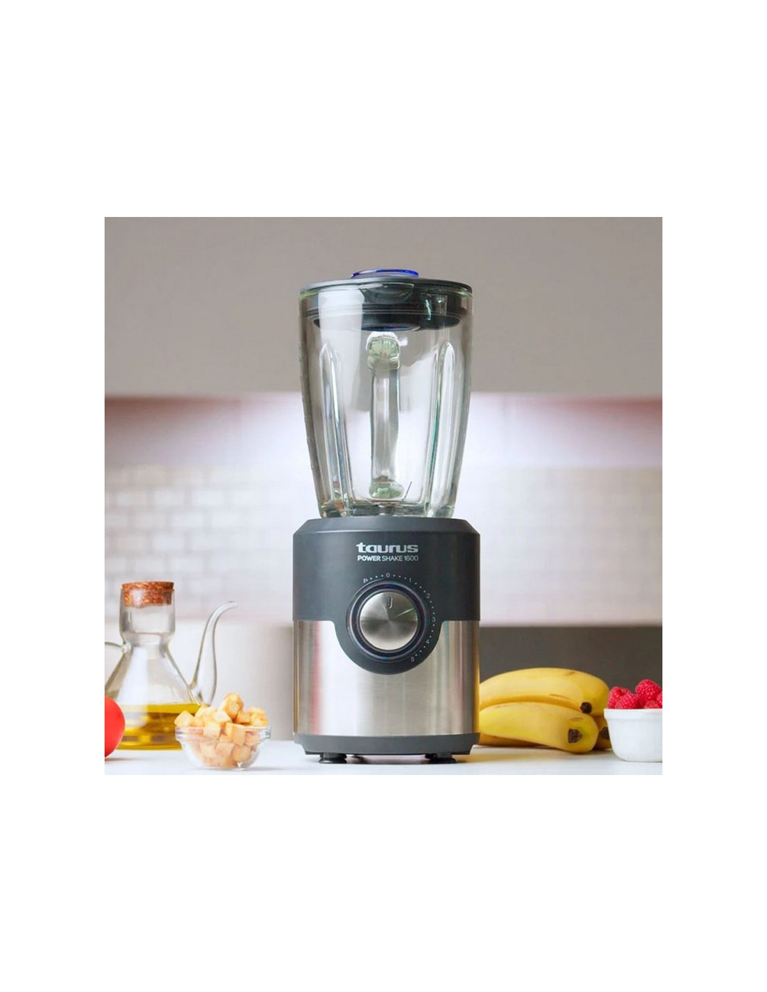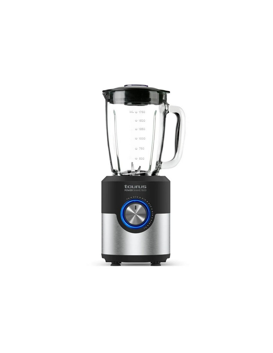 Batidora de vaso TAURUS Power Shake Cuchillas de acero inox. 5 velocidades + función turbo, boca de llenado y rejilla de filtraje en la tapa. Iluminación LED en el selector. Sistema de seguridad, solo funciona cuando la jarra está bloqueada. Potencia: 1.600 W.