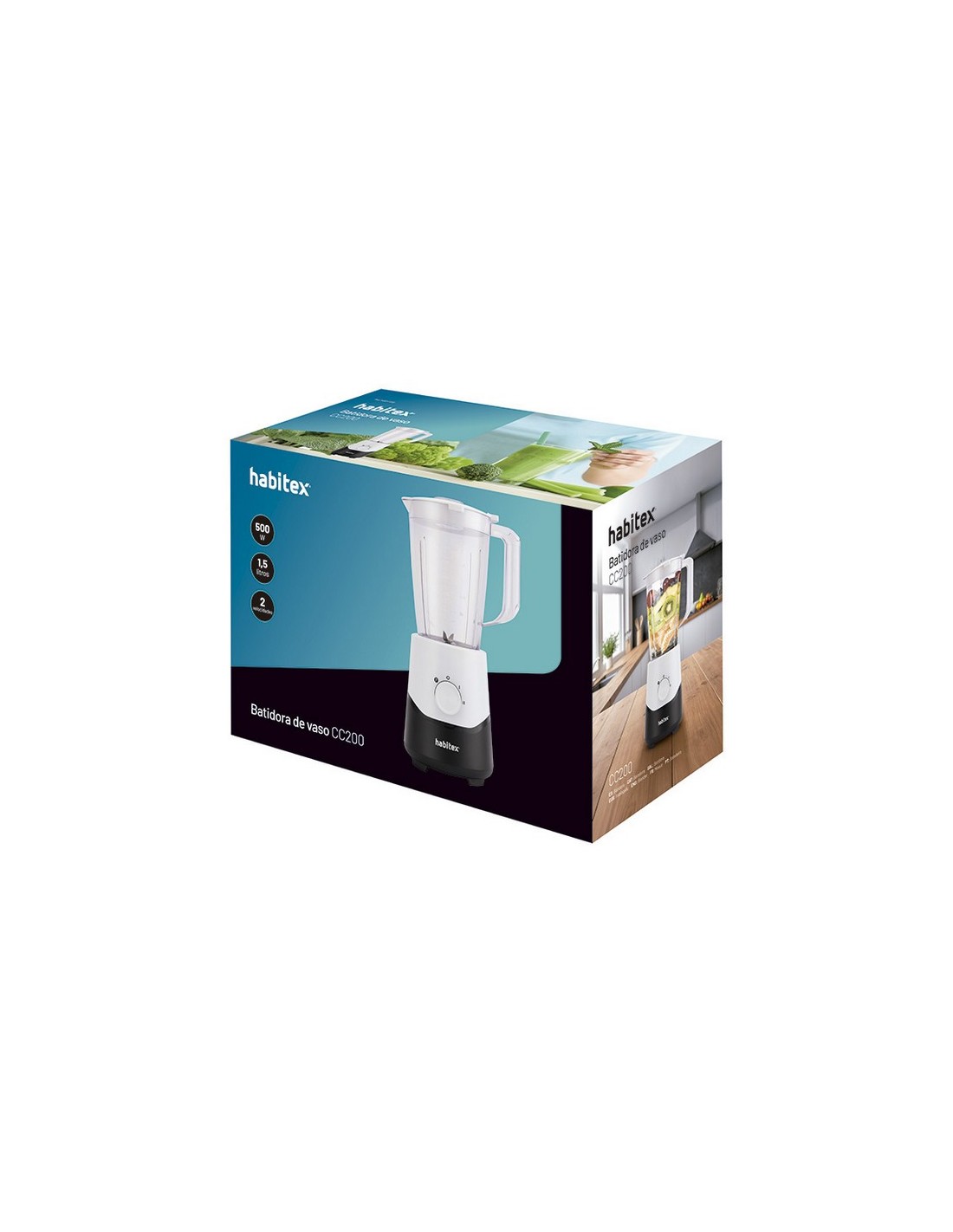 Batidora de vaso HABITEX CC200 Cuerpo y jarra de plástico. 2 velocidades + función turbo. Cuchillas acero inox. garantizan una mezcla eficiente. Sistema de bloqueo de la jarra asegura mayor seguridad. Incluye taza medidora para preparación. Potencia: 500 W.