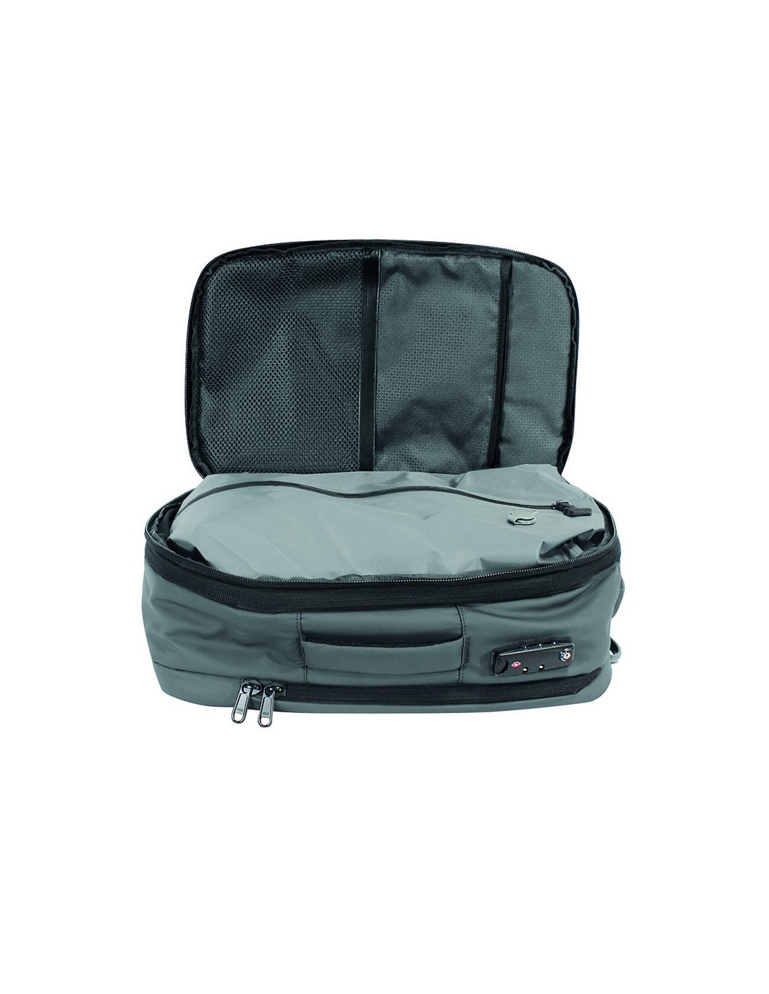 Mochila de viaje Vacuum Lagart gris 20 litros extensible a 42 litros. Vaciador de aire Incluido. Bolsillo trasero antirobo y bolsillo lateral para botella. Cierre candado TSA. . 30x20xh48 cm.