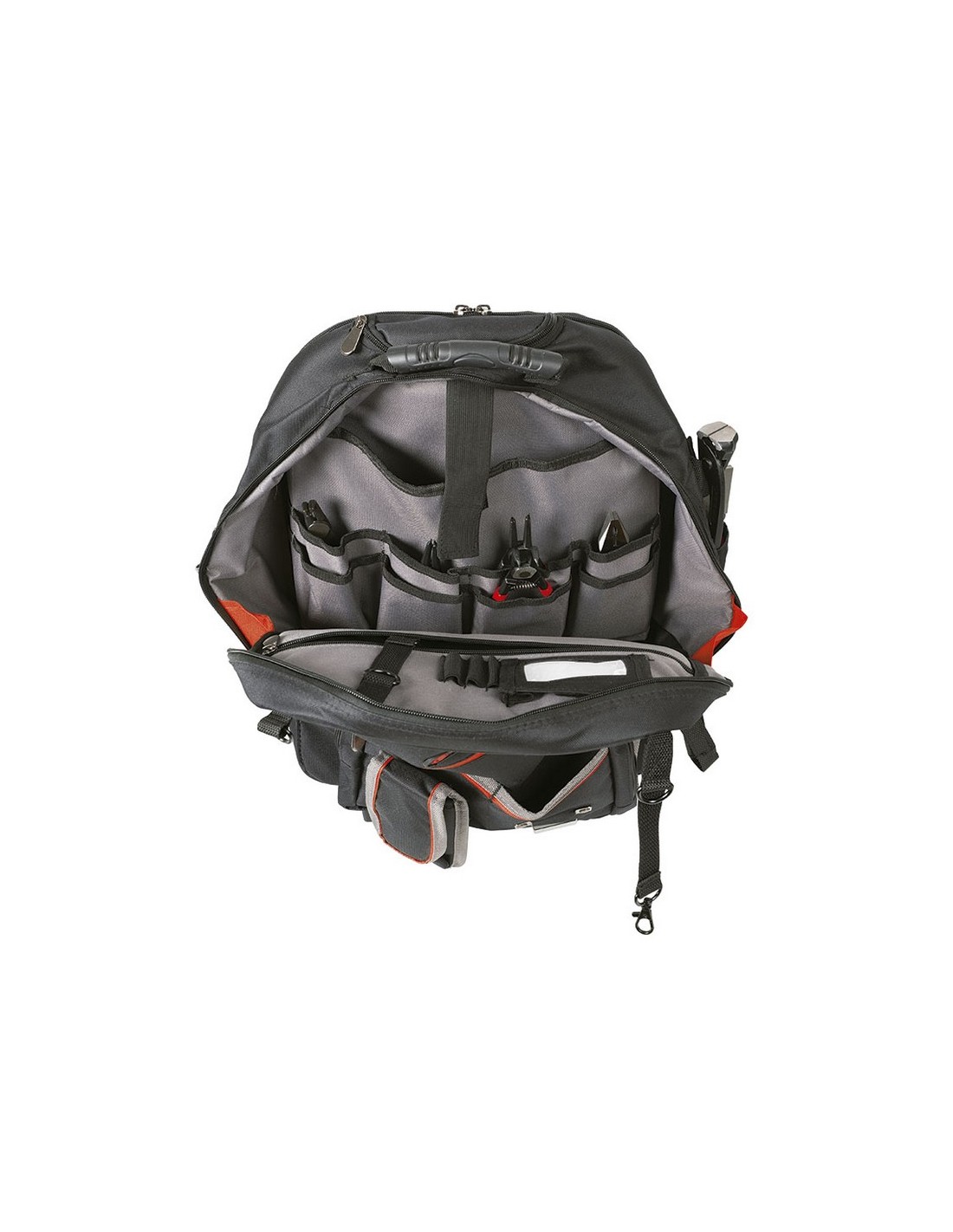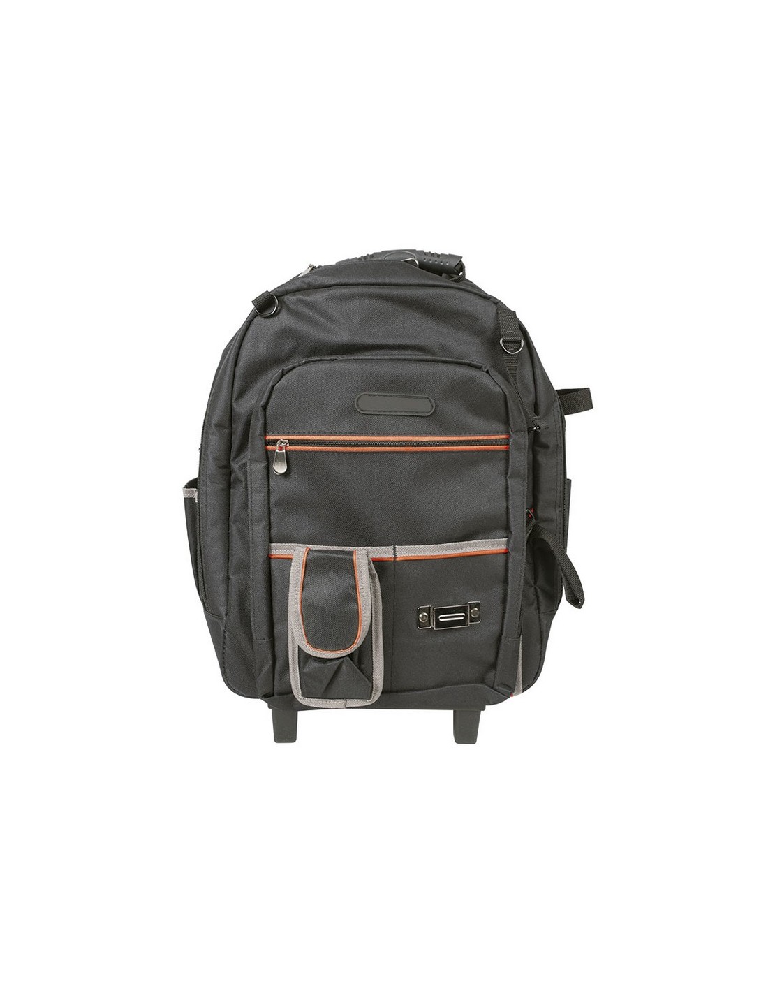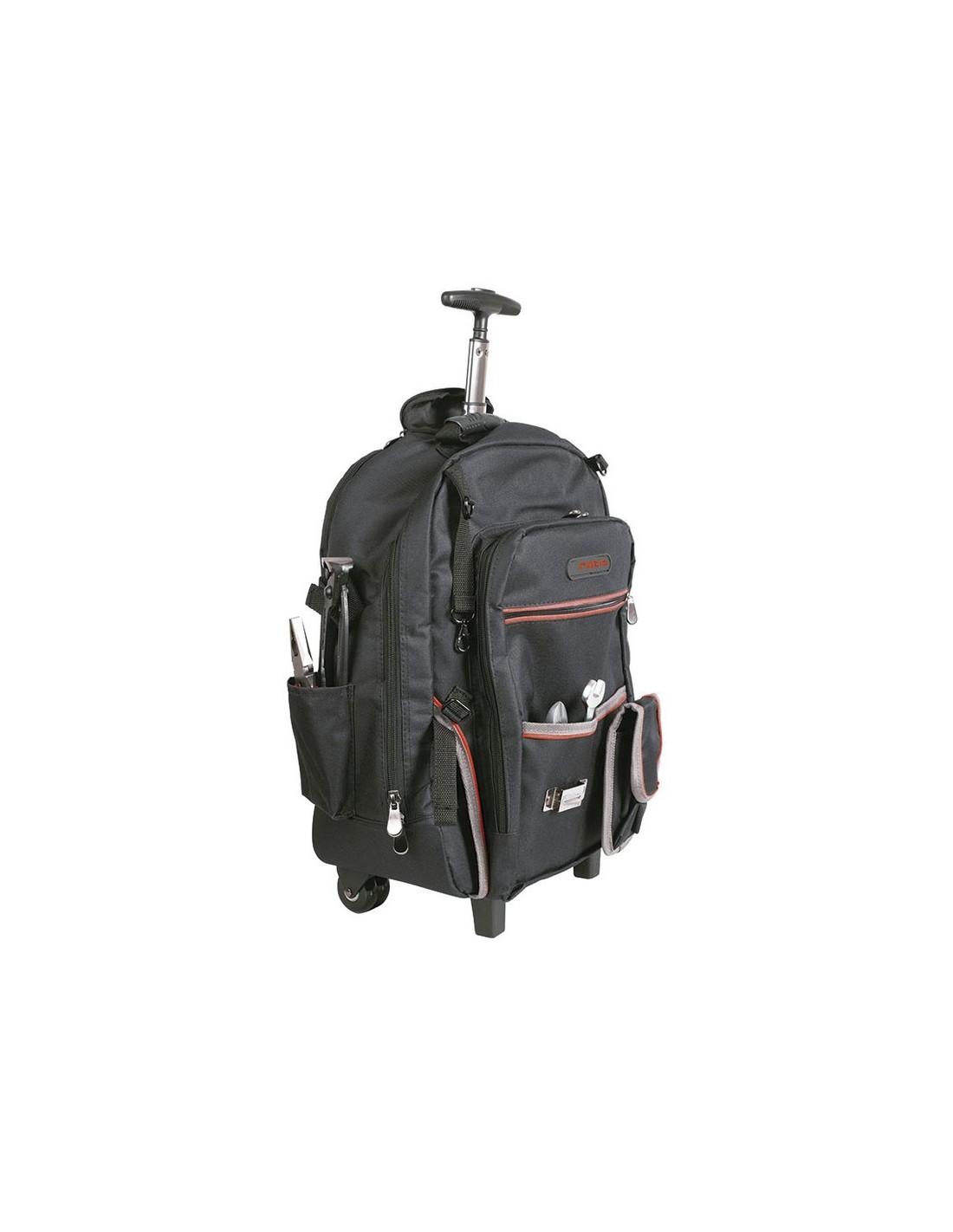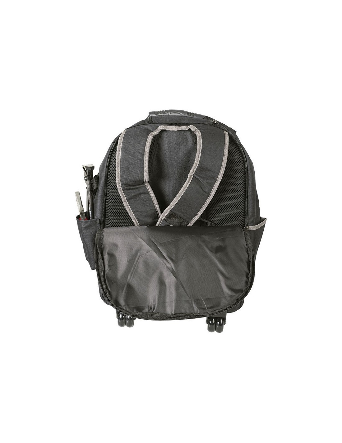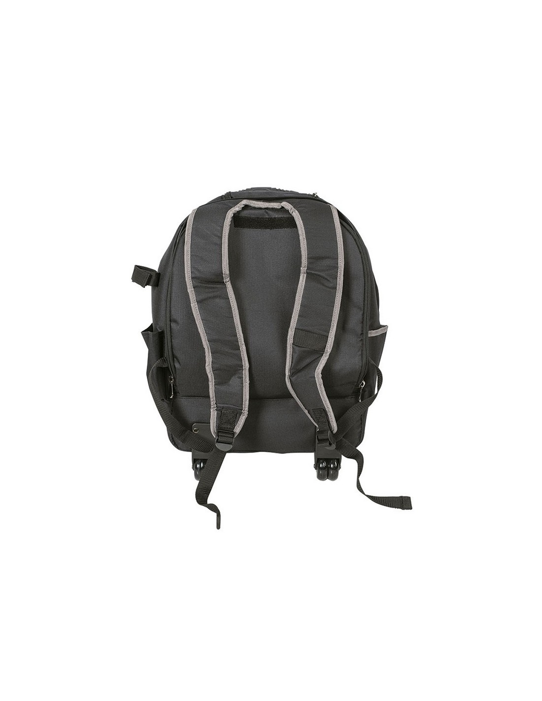 Mochila portaherramientas RATIO 5053-19 Tejido alta resistencia, 600 deniers. Bolsas interiores y compartimientos. Correas acolchadas ajustables con empuñadura de transporte en la parte superior. Empuñadura telescópica y ruedas integradas. 18 bolsillos para organizar herramientas y accesorios. Dos compartimentos principales con doble cremallera. Dimensiones: 36x21xh.50 cm.