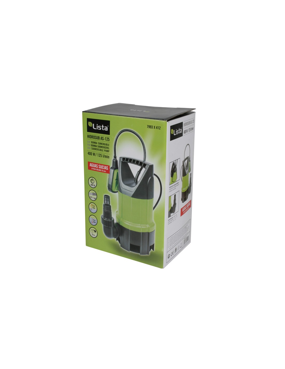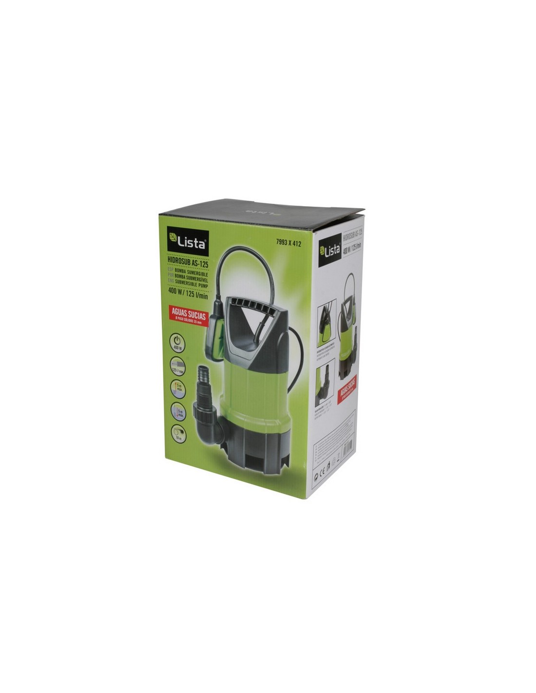 Bomba drenaje LISTA Hidrosub AS-125 Sumergible aguas sucias. Cable 10 m. Salida de 1"-1.1/4"-1.1/2". Potencia absorbida: 400 W.