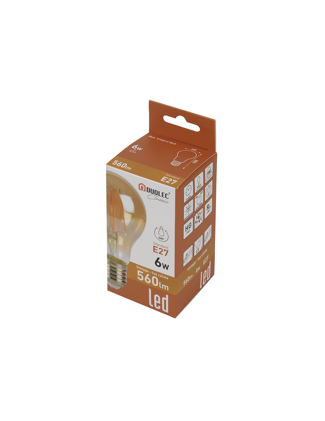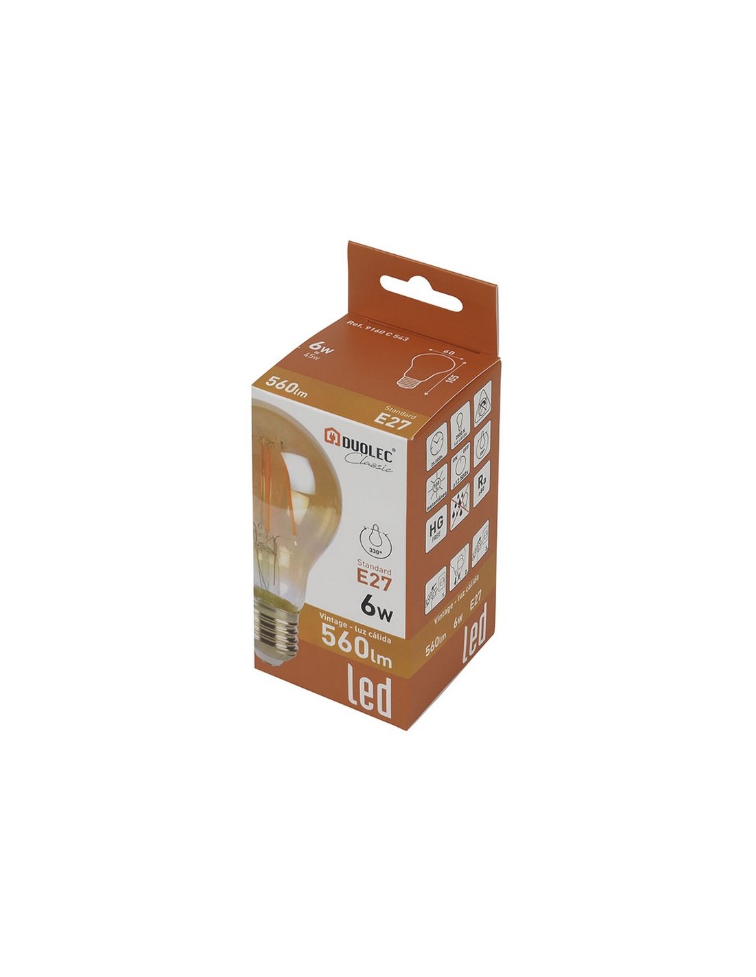 Bombilla estándar E27 Led DUOLEC Classic Vintage Rosca E27. Encendido instantáneo. Vida útil 25.000 horas.. 6 W. 530 lm. 2500 K. ø 60x105 mm.