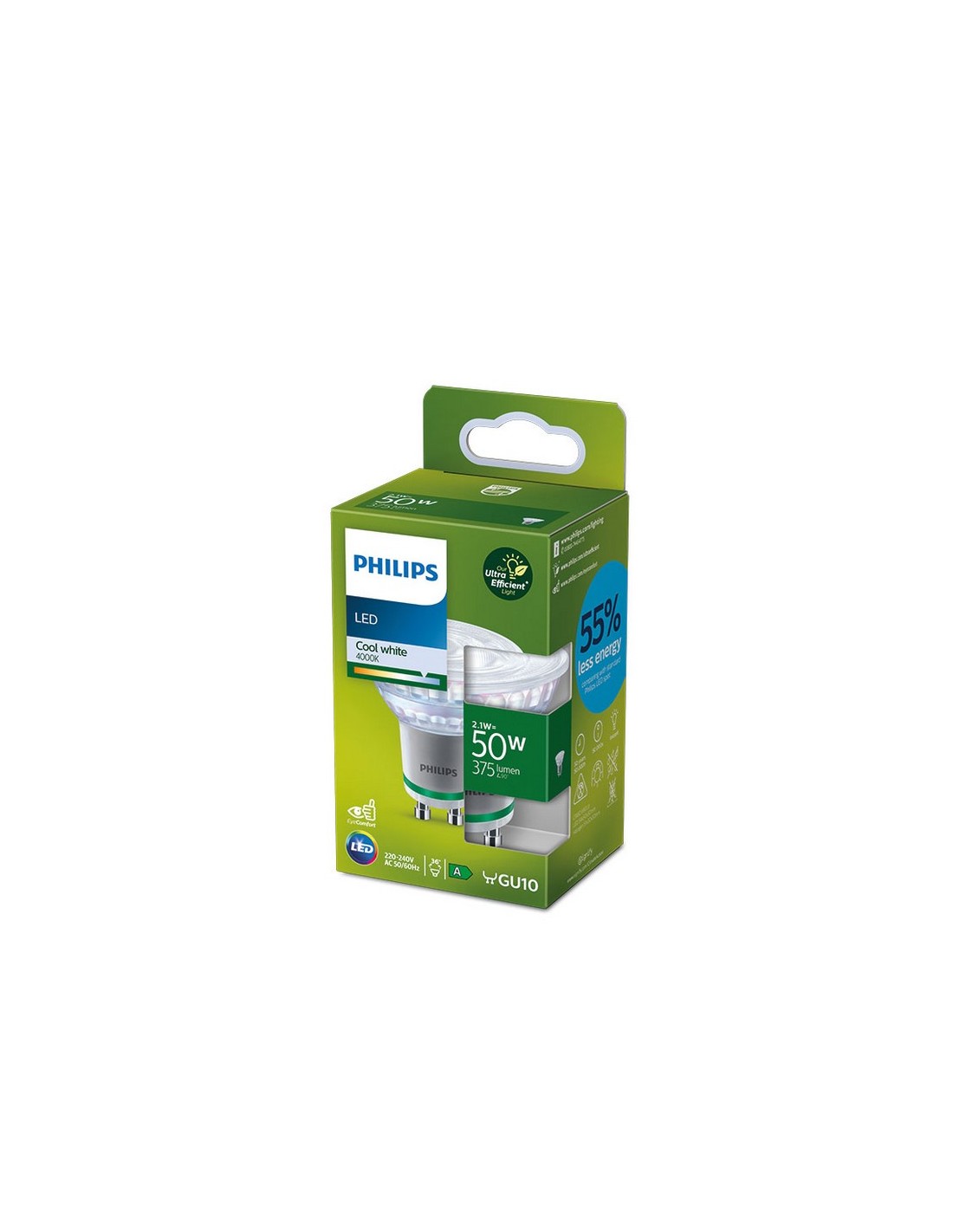 Bombilla dicroica GU10 Led PHILIPS Granpotencia lumínica. Encendido instantáneo. Vida útil 50.000 h. 50 W. 375 lm. 4000K. ø 50x54 mm.