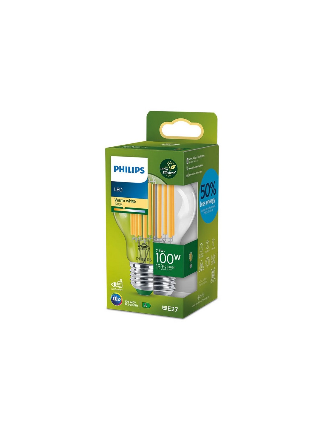 Bombilla estándar E27 PHILIPS ultraeficiente Classic transparente Gran potencia lumínica ultra eficiente. Tipo filamento de cristal transparente. 2 temperaturas de color (luz cálida y luz día). Vida útil 50.000 h. 7,3 W. 1535 lm. 2700K. 1040x60 mm.