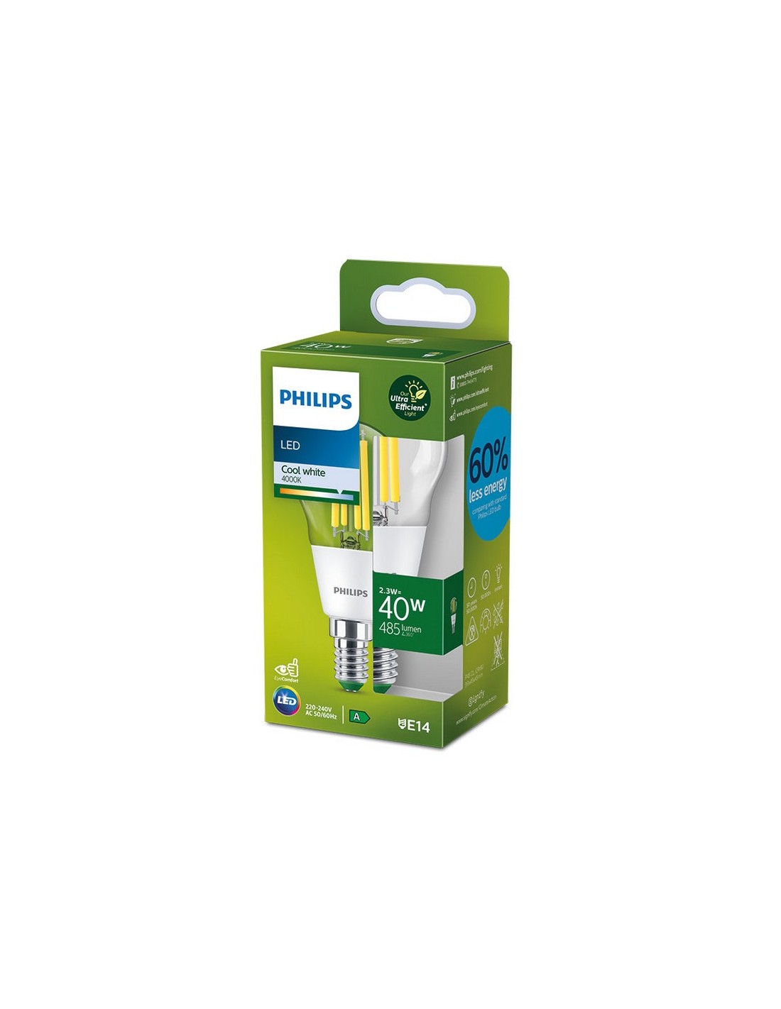 Bombilla esférica E14 PHILIPS ultraeficiente Classic transparente Gran potencia lumínica ultra eficiente. Tipo filamento de cristal transparente. 2 temperaturas de color (luz cálida y luz día). Vida útil 50.000 h. 2,3 W. 485 lm. 4000K. 900x450 mm.
