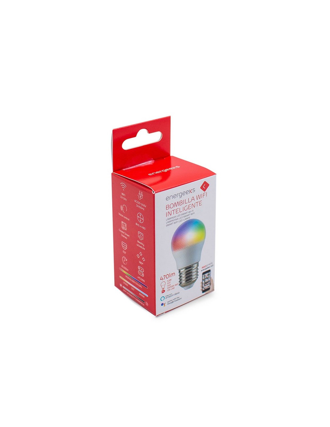 Bombilla Led Wifi miniglobo E27 ENERGEEKS CCT + RGB. Rosca E27. Bombillas inteligentes conectables desde cualquier parte con tu dispositivo móvil. Compatible con Alexa y Google Assistant. Programa y ahorra con la iluminación de tu estancia. Fácil instalación. Iluminación regulable de 2700K a 6500K y colores RGB. 5 W. 470 lm. ø 45x80 mm.