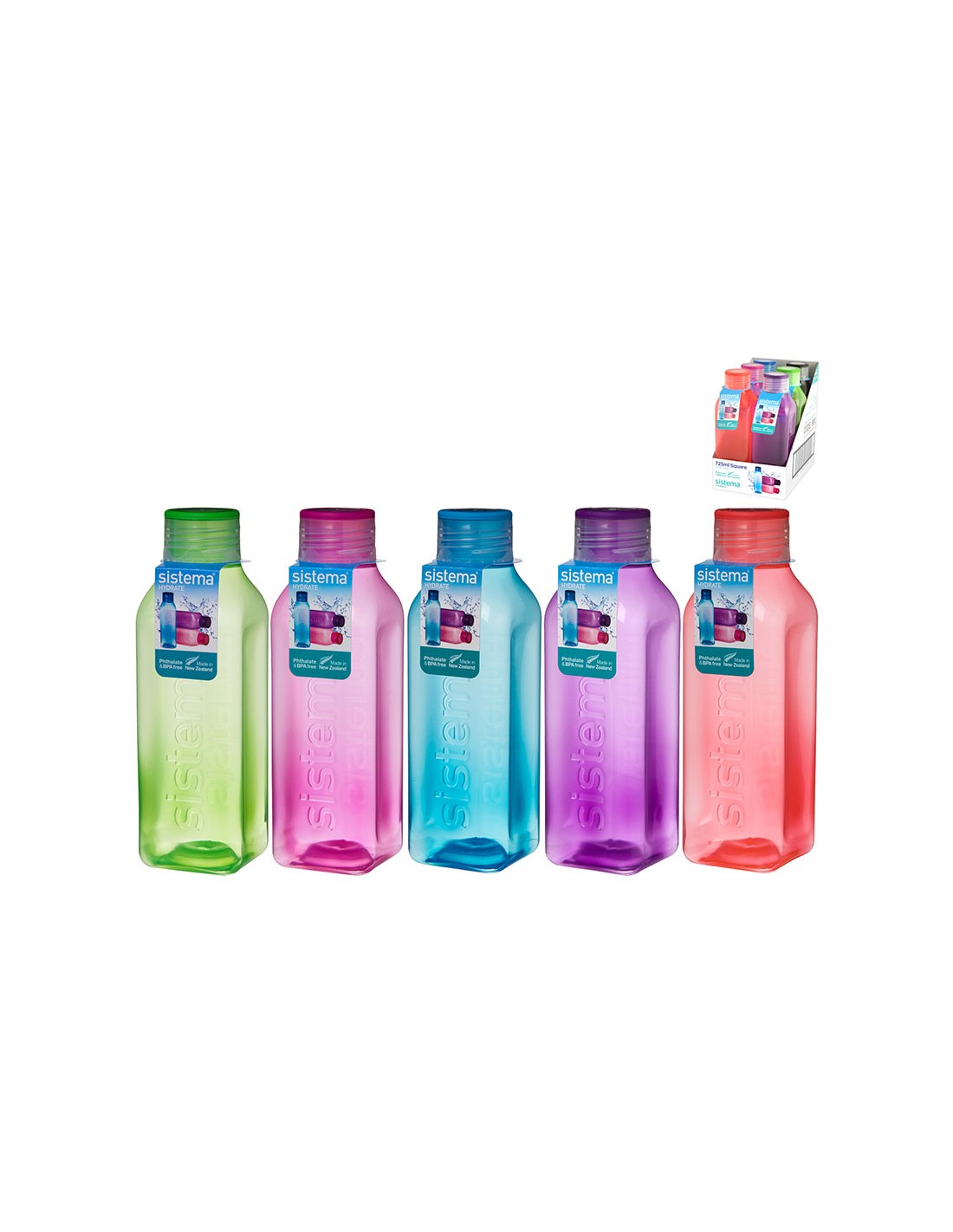 Botella hermética Square (MEMO) 720 ml. Se sirve en una caja de 6 botellas en colores surtidos.