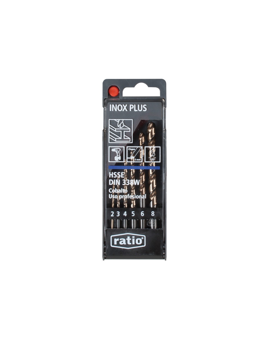 Broca metal RATIO Inox-Plus Estuche plástico 6 brocas. Acero al cobalto HSSE 5% Co. DIN 338 W. Aplicación sobre todo tipo de metales. Ideal para cordless gracias a su diseño de hélice y ángulo de ataque de 135º. Reduce la fricción y gana en rapidez para mayor duración de baterí ø 2-3-4-5-6-8 mm.