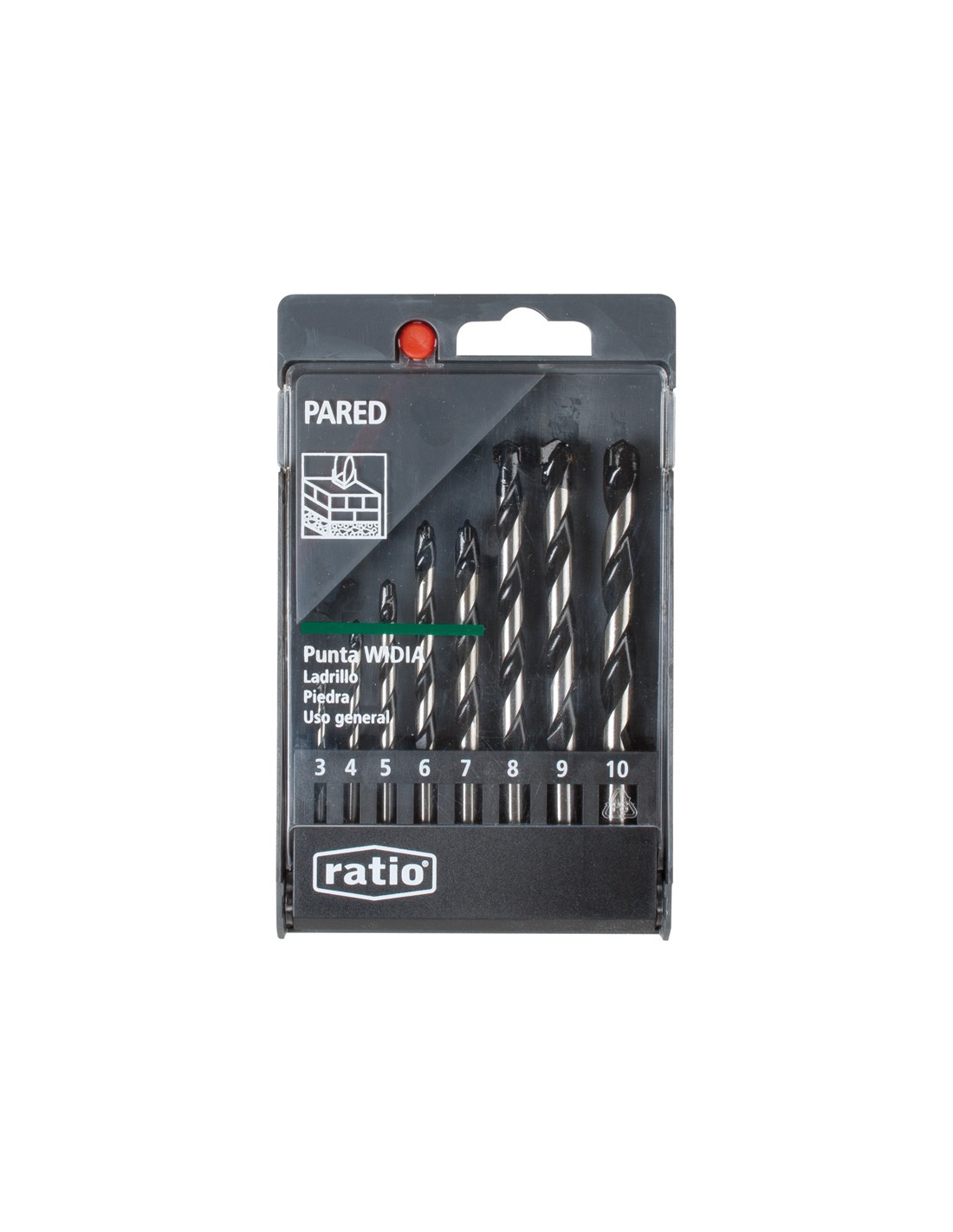 Broca pared RATIO 1589 Punta carburo tungsteno. DIN 8039. Estuche plástico. 8 piezas. ø 3-4-5-6-7-8-9-10 mm.