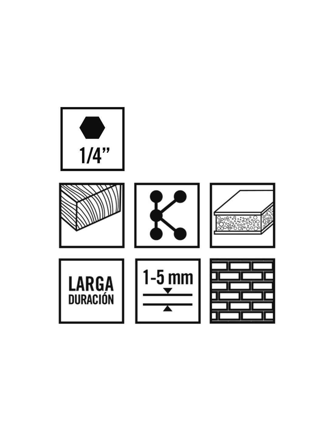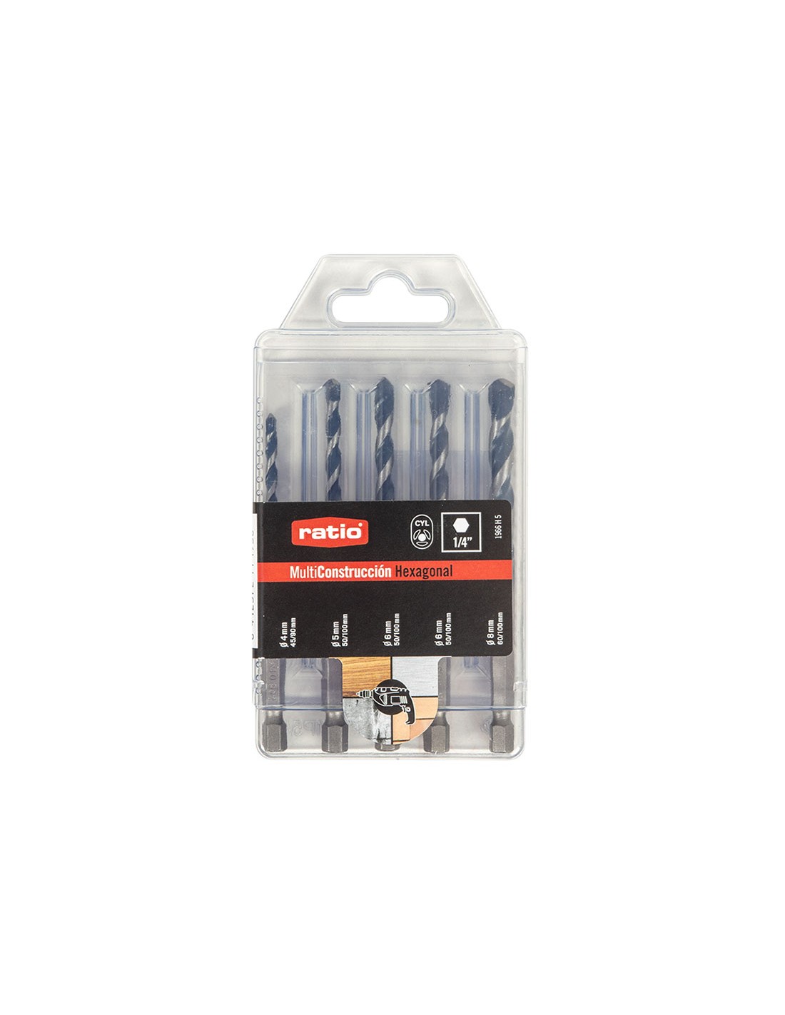 Broca MultiConstrucción RATIO anclaje hexagonal 1/4" Juego 5 brocas. Para taladrar todo tipo de materiales (madera, metal, cerámica blanda, hormigón...) o materiales multi-capa con o sin percusión, con taladro o atornillador gracias a su inserción de 1/4". Punta centradora que proporciona una perforaci ø 4x45x90 mm. (1 unid.)\r\nø 5x50x100 mm. (1 unid.)\r\nø 6x50x100 mm. (2 unid.)\r\nø 8x60x100 mm. (1 unid.)