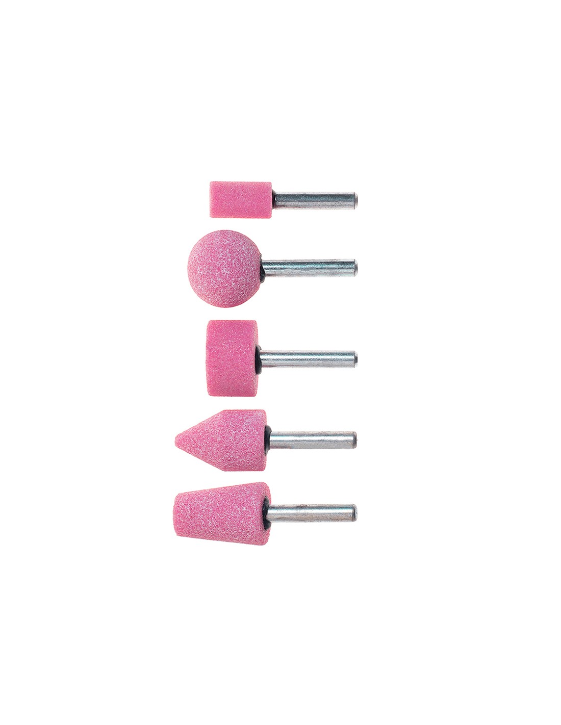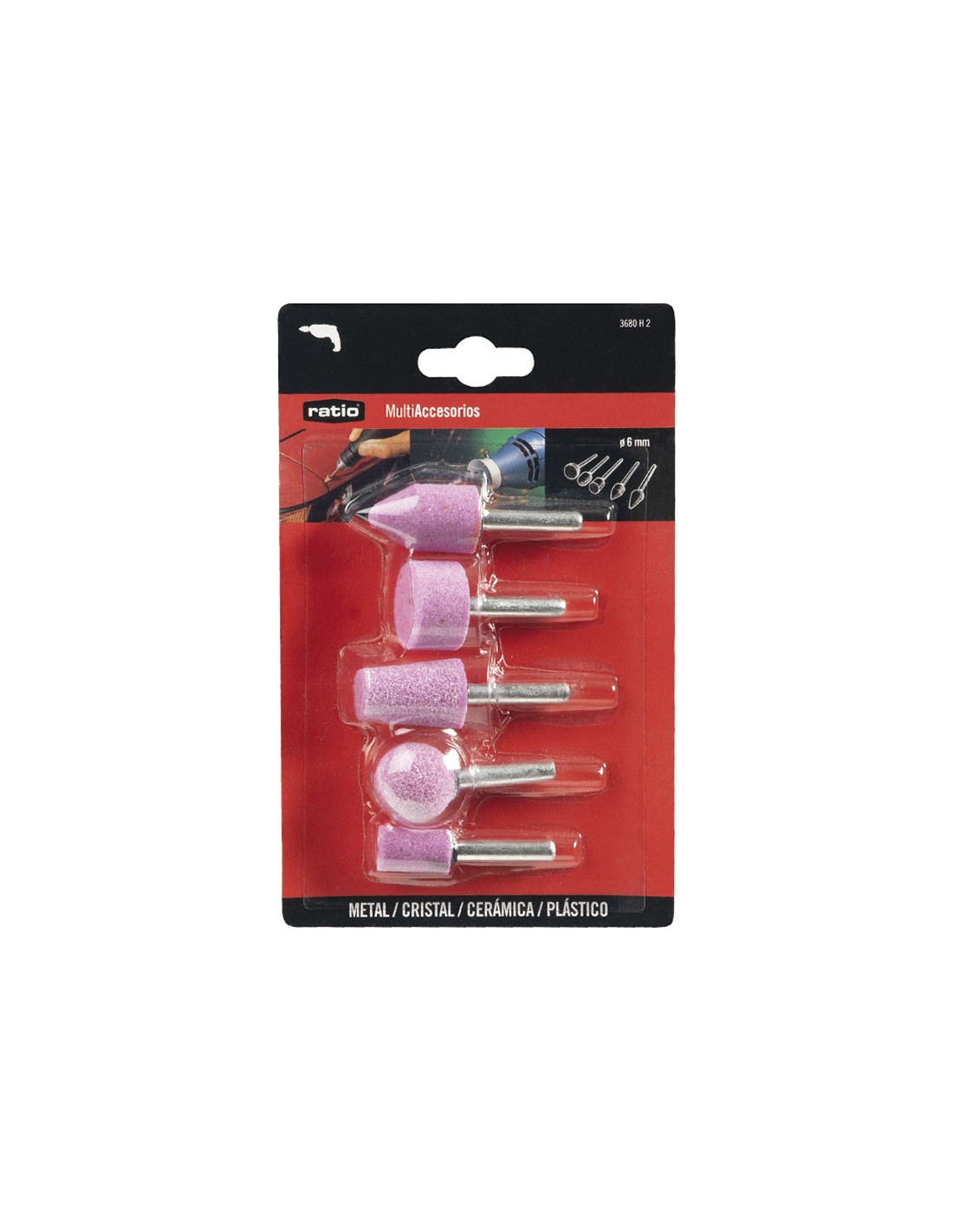 Muela abrasiva con vástago RATIO Juego 5 unidades surtidas. Para metal, vidrio, cerámica y plástico. Corindón rosa. Vástago ø 6 mm.